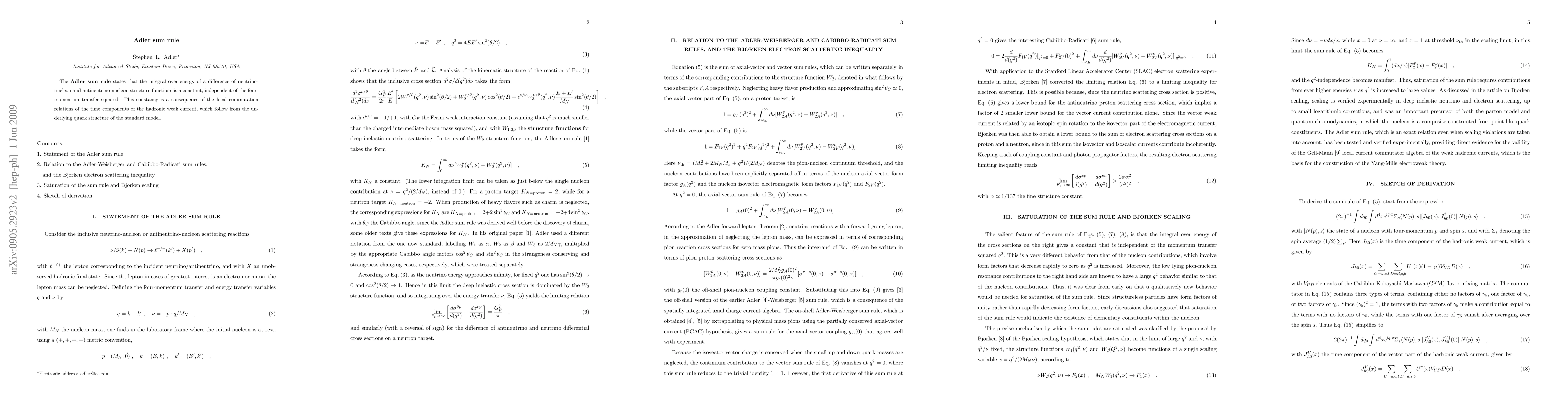The Adler sum rule asserts a constant integral over energy of the difference between neutrino-nucleon and antineutrino-nucleon structure functions, independent of four-momentum transfer squared. This invariance arises from the local commutation relations of the hadronic weak current in the standard model.