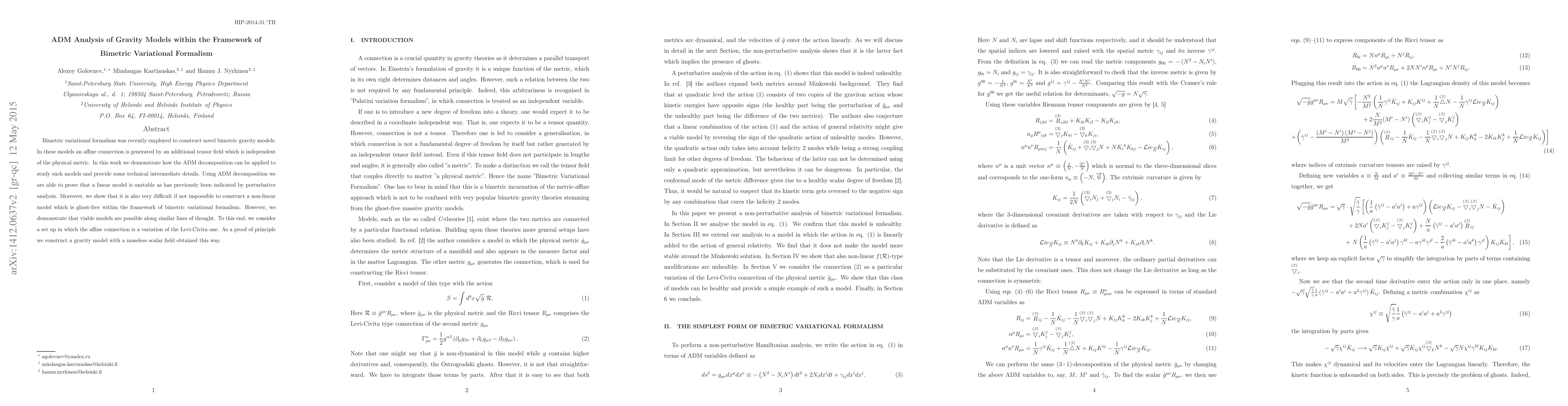 This paper applies the ADM decomposition to bimetric gravity models constructed using the bimetric variational formalism, demonstrating the instability of linear models and the difficulty of creating ghost-free non-linear models. It proposes a viable model by modifying the Levi-Civita connection, constructing a gravity model with a massless scalar field as a proof of concept.