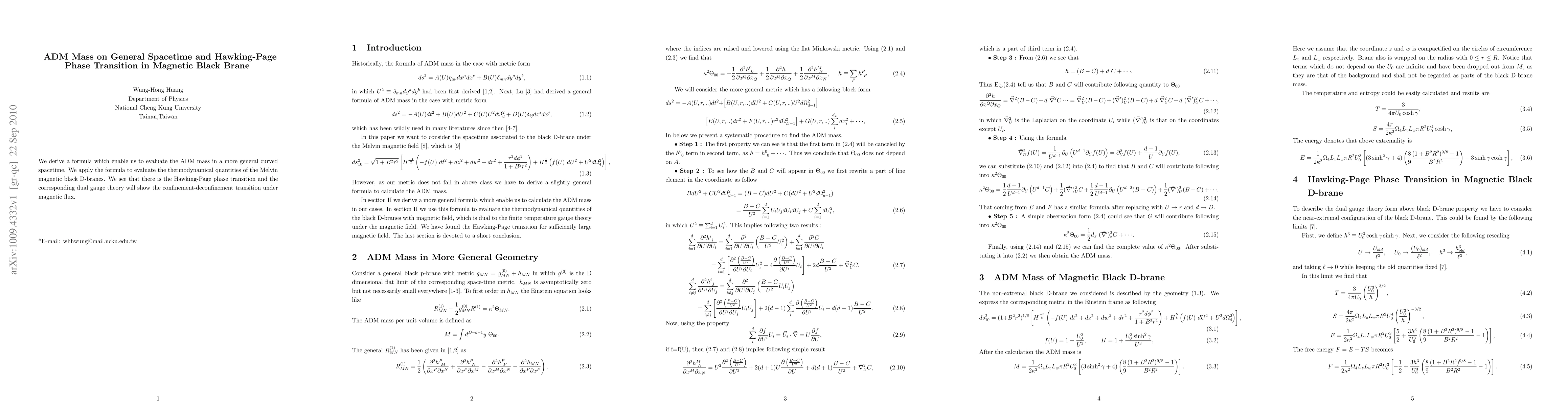 We derive a formula which enable us to evaluate the ADM mass in a more general curved spacetime. We apply the formula to evaluate the thermodynamical quantities of the Melvin magnetic black D-branes. We see that there is the Hawking-Page phase transition and the corresponding dual gauge theory will show the confinement-deconfinement transition under magnetic flux.