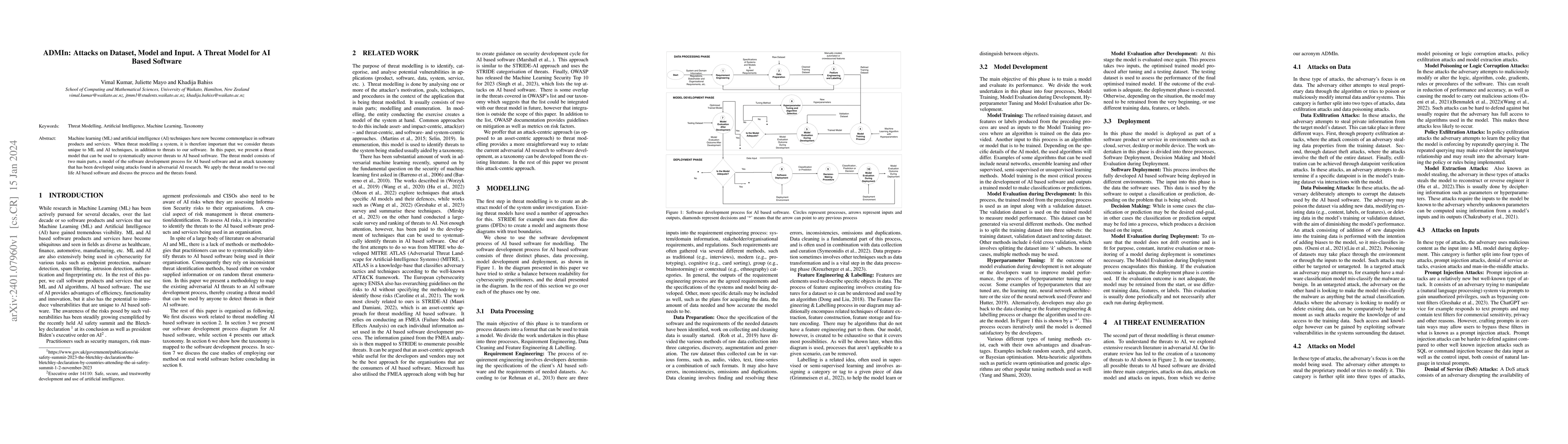 This paper introduces a comprehensive threat model for AI-based software, focusing on threats to datasets, models, and inputs. It combines a software development process model for AI and an attack taxonomy derived from adversarial AI research to systematically identify potential threats.
