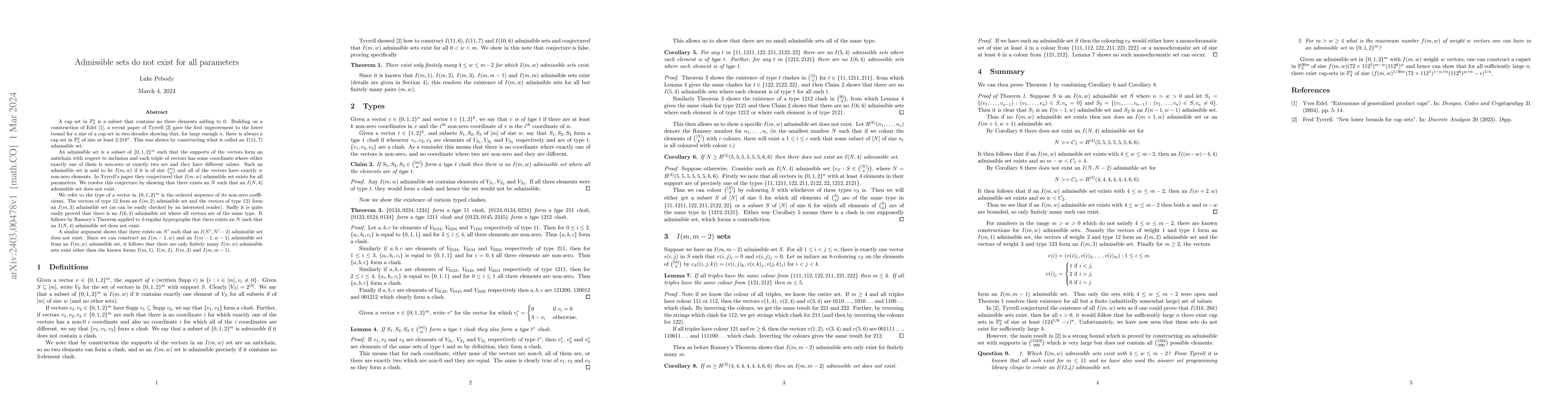 A cap set in $\mathbb{F}_3^n$ is a subset that contains no three elements adding to 0. Building on a construction of Edel, a recent paper of Tyrrell gave the first improvement to the lower bound for a size of a cap set in two decades showing that, for large enough $n$, there is always a cap set in $\mathbb{F}_3^n$ of size at least $2.218^n$. This was shown by constructing what is called an $I(11,7)$ admissible set. An admissible set is a subset of $\{0,1,2\}^m$ such that the supports of the vectors form an antichain with respect to inclusion and each triple of vectors has some coordinate where either exactly one of them is non-zero or exactly two are and they have different values. Such an admissible set is said to be $I(m,w)$ if it is of size $\binom mw$ and all of the vectors have exactly $w$ non-zero elements. In Tyrrell's paper they conjectured that $I(m,w)$ admissible set exists for all parameters. We resolve this conjecture by showing that there exists an $N$ such that an $I(N,4)$ admissible set does not exist. We refer to the type of a vector in $\{0,1,2\}^m$ is the ordered sequence of its non-zero coefficients. The vectors of type $12$ form an $I(m,2)$ admissible set and the vectors of type $121$ form an $I(m,3)$ admissible set (as can be easily checked by an interested reader). Sadly it is quite easily proved that there is no $I(6,4)$ admissible set where all vectors are of the same type. It follows by Ramsey's Theorem applied to 4-regular hypergraphs that there exists an $N$ such that an $I(N,4)$ admissible set does not exist. A similar argument shows that there exists an $N'$ such that an $I(N',N'-2)$ admissible set does not exist. Since we can construct an $I(m-1,w)$ and an $I(m-1,w-1)$ admissible set from an $I(m,w)$ admissible set, it follows that there are only finitely many $I(m,w)$ admissible sets exist other than the known forms.