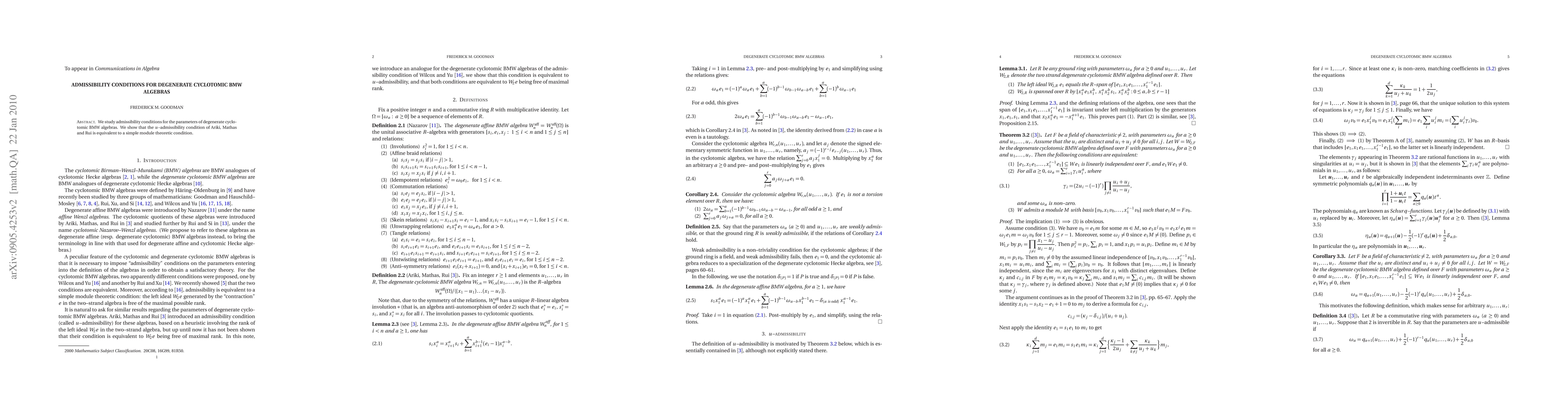 Summary: This paper investigates the admissibility conditions for degenerate cyclotomic BMW algebras, proving that the u-admissibility condition by Ariki, Mathas, and Rui is equivalent to a straightforward module-theoretic condition.