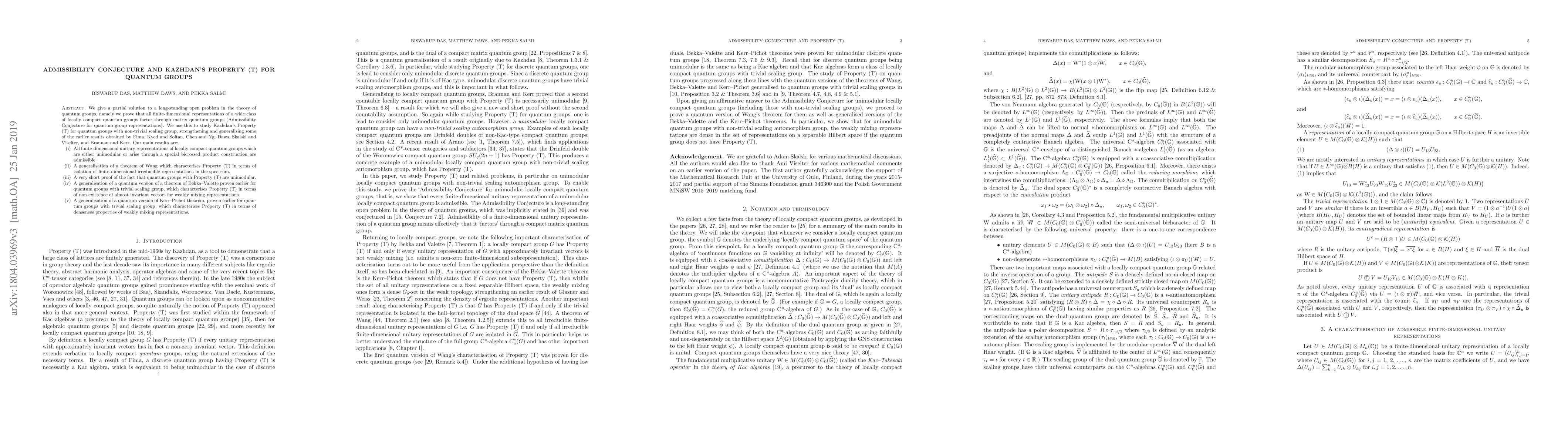 This paper provides a partial resolution to the Admissibility Conjecture for quantum group representations, proving that all finite-dimensional representations of a broad class of locally compact quantum groups factor through matrix quantum groups. It also generalizes and strengthens prior results on Kazhdan's Property (T) for quantum groups with non-trivial scaling, including a proof that quantum groups with Property (T) are unimodular.