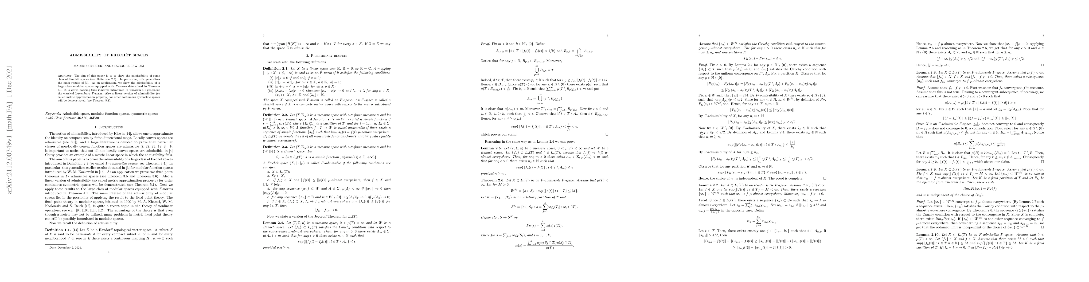 This paper demonstrates the admissibility of a class of Frechet spaces, extending previous results, and applies this to modular spaces with F-norms, including a generalized version of the Luxemburg norm. Additionally, it introduces a linear version of admissibility for order continuous symmetric spaces.