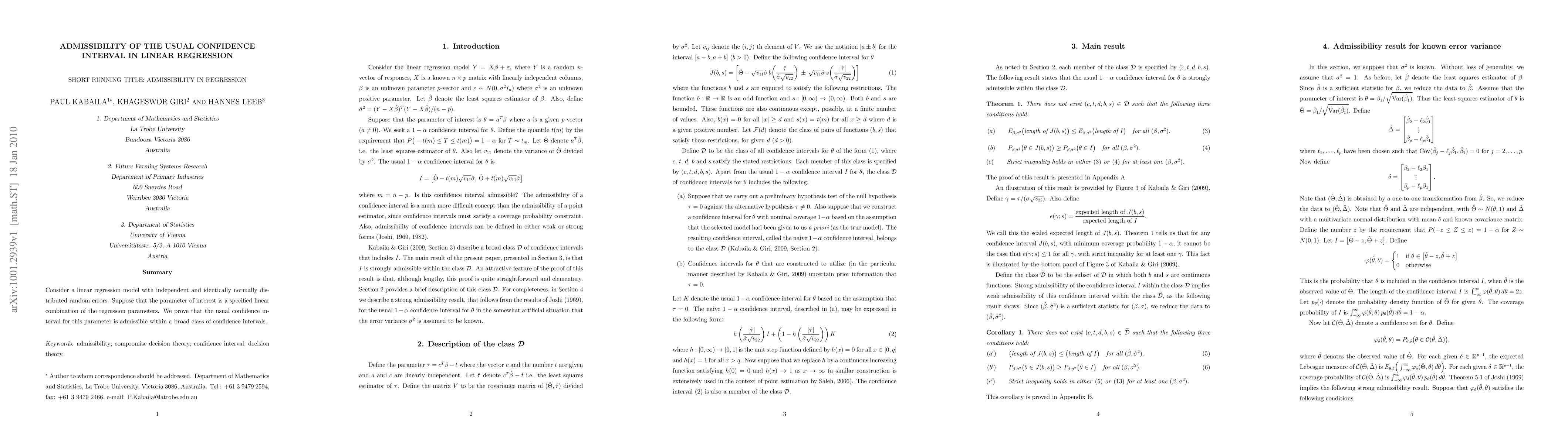 Summary: The paper proves that the traditional confidence interval for a specified linear combination of regression parameters in a normally distributed linear regression model is admissible among a wide range of confidence intervals. The result holds under the assumption of independent and identically distributed random errors.
