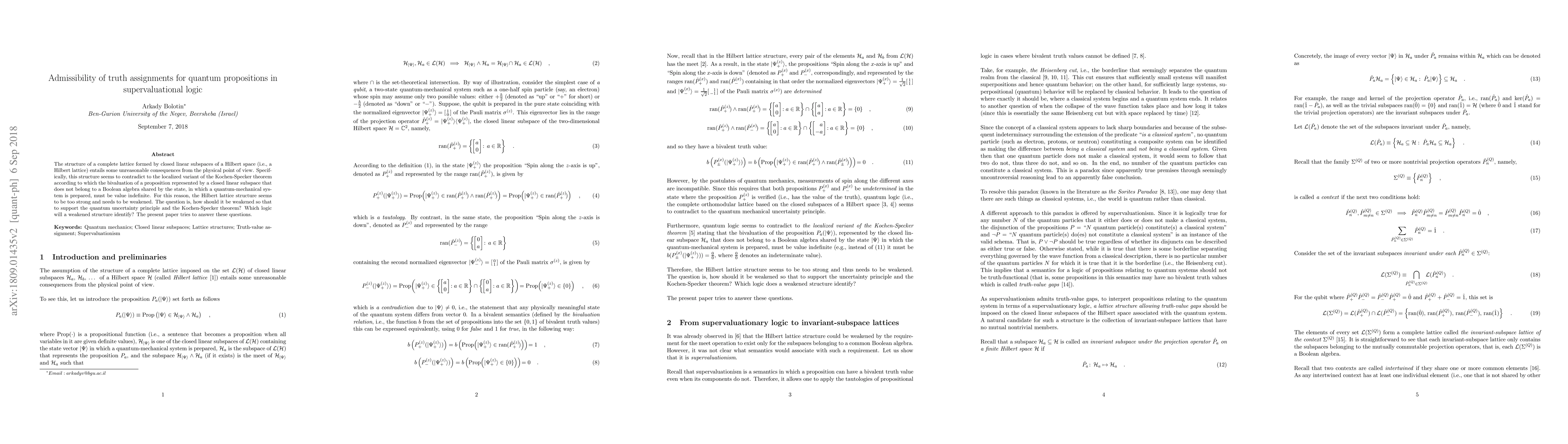 The structure of a complete lattice formed by closed linear subspaces of a Hilbert space (i.e., a Hilbert lattice) entails some unreasonable consequences from the physical point of view. Specifically, this structure seems to contradict to the localized variant of the Kochen-Specker theorem according to which the bivaluation of a proposition represented by a closed linear subspace that does not belong to a Boolean algebra shared by the state, in which a quantum-mechanical system is prepared, must be value indefinite. For this reason, the Hilbert lattice structure seems to be too strong and needs to be weakened. The question is, how should it be weakened so that to support the quantum uncertainty principle and the Kochen-Specker theorem? Which logic will a weakened structure identify? The present paper tries to answer these questions.