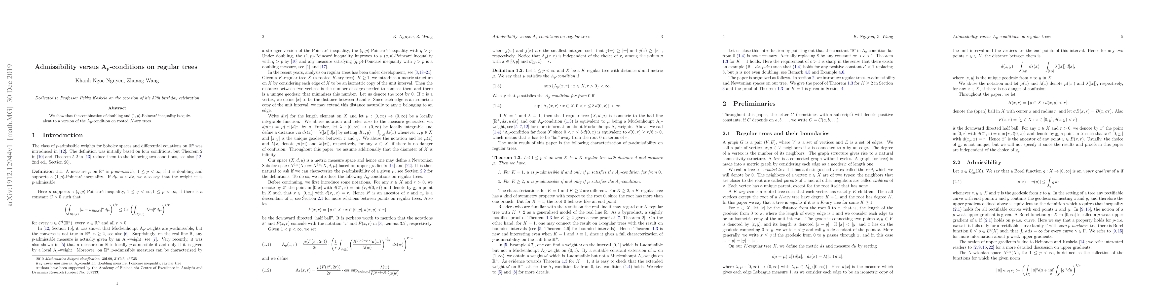 Summary: This paper demonstrates that the combination of doubling and $(1,p)$-Poincare inequality on rooted K-ary trees is equivalent to a version of the $A_p$-condition, establishing a connection between admissibility and $A_p$-conditions on regular trees.