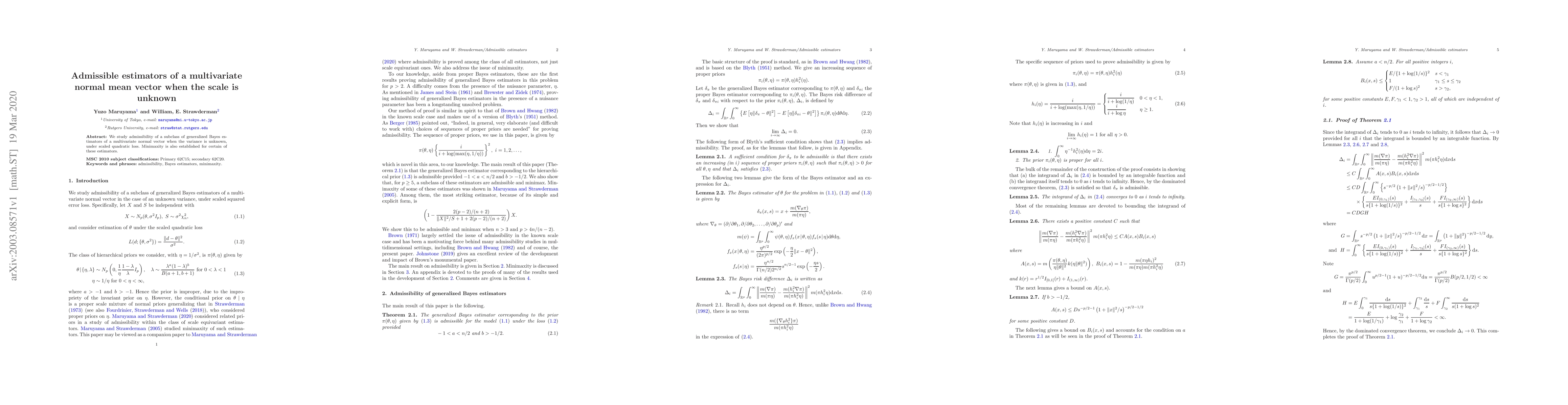 Summary: This paper examines the admissibility of generalized Bayes estimators for a multivariate normal mean vector with unknown variance under scaled quadratic loss, and establishes minimaxity for specific estimators within this subclass.