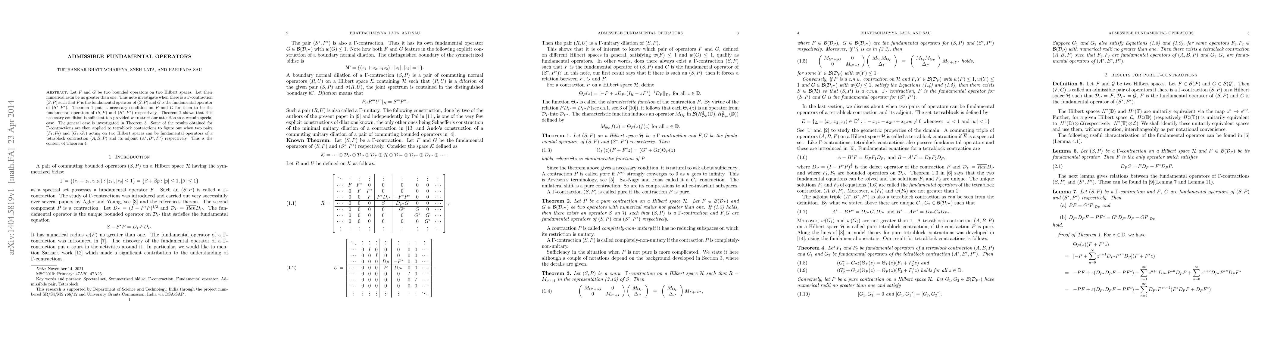 Let $F$ and $G$ be two bounded operators on two Hilbert spaces. Let their numerical radii be no greater than one. This note investigate when there is a $\Gamma$-contraction $(S,P)$ such that $F$ is the fundamental operator of $(S,P)$ and $G$ is the fundamental operator of $(S^*,P^*)$. Theorem 1 puts a necessary condition on $F$ and $G$ for them to be the fundamental operators of $(S,P)$ and $(S^*,P^*)$ respectively. Theorem 2 shows that this necessary condition is sufficient too provided we restrict our attention to a certain special case. The general case is investigated in Theorem 3. Some of the results obtained for $\Gamma$-contractions are then applied to tetrablock contractions to figure out when two pairs $(F_1, F_2)$ and $(G_1, G_2)$ acting on two Hilbert spaces can be fundamental operators of a tetrablock contraction $(A, B, P)$ and its adjoint $(A^*, B^*, P^*)$ respectively. This is the content of Theorem 4.