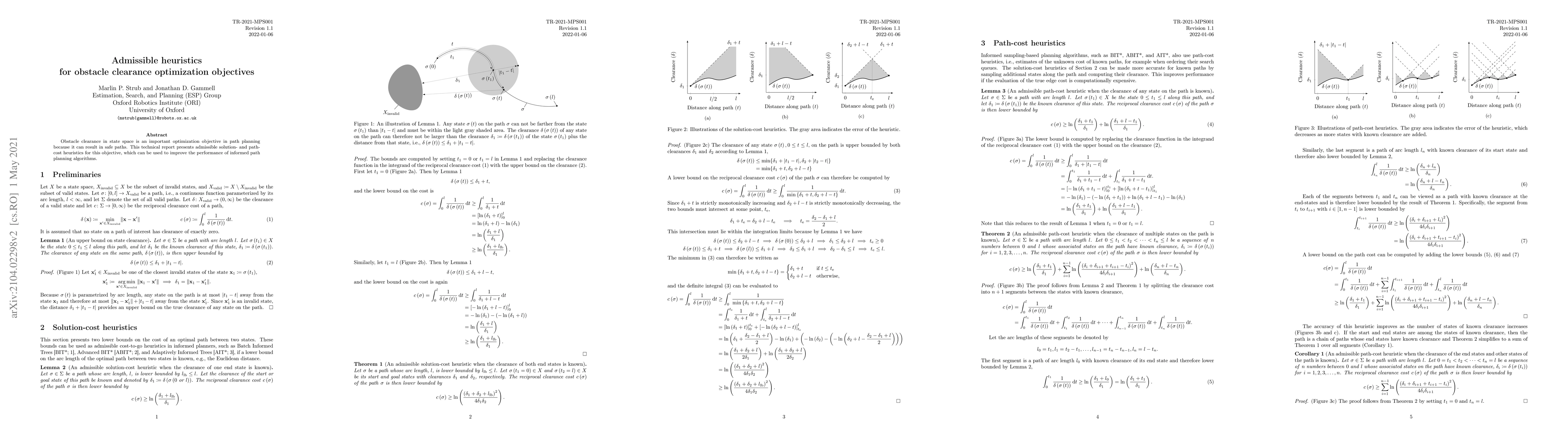 Obstacle clearance in state space is an important optimization objective in path planning because it can result in safe paths. This technical report presents admissible solution- and path-cost heuristics for this objective, which can be used to improve the performance of informed path planning algorithms.