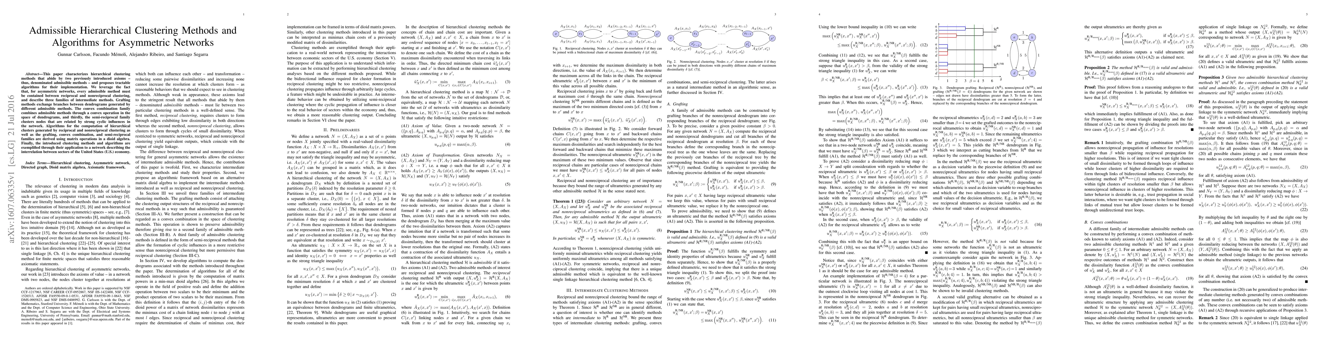 This paper identifies and characterizes admissible hierarchical clustering methods for asymmetric networks, proposing algorithms for their implementation, including grafting, convex combination, and semi-reciprocal methods. The methods are demonstrated through application to a U.S. economic sector network.