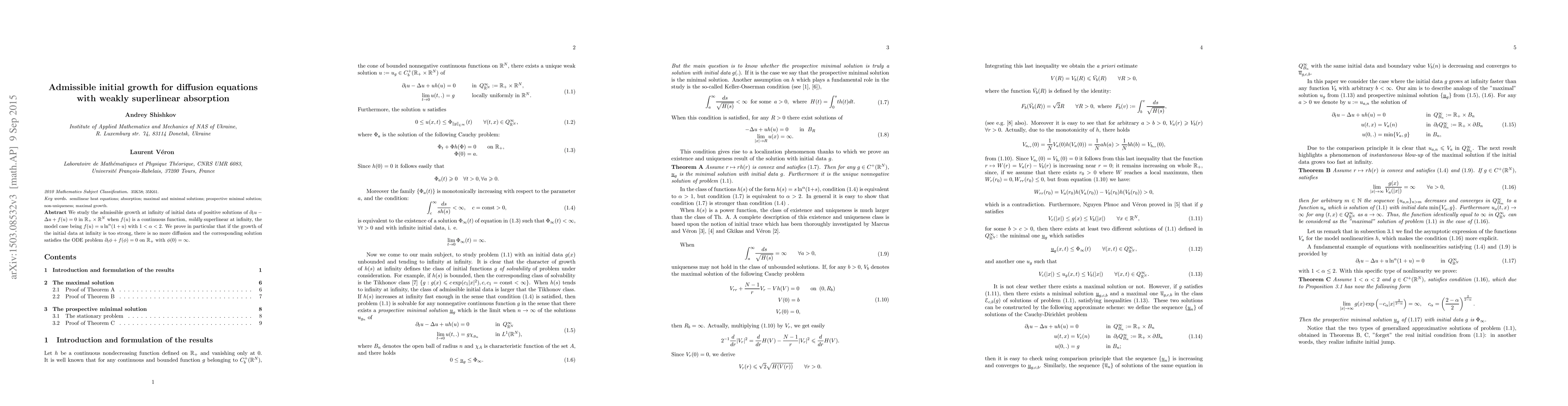 This paper explores the permissible initial growth conditions for positive solutions of diffusion equations with weakly superlinear absorption, showing that excessively strong initial growth leads to a solution that behaves like an ODE rather than a diffusion equation. The specific case of $f(u)=u\ln^\ga (1+u)$ with $1< \ga < 2$ is examined.