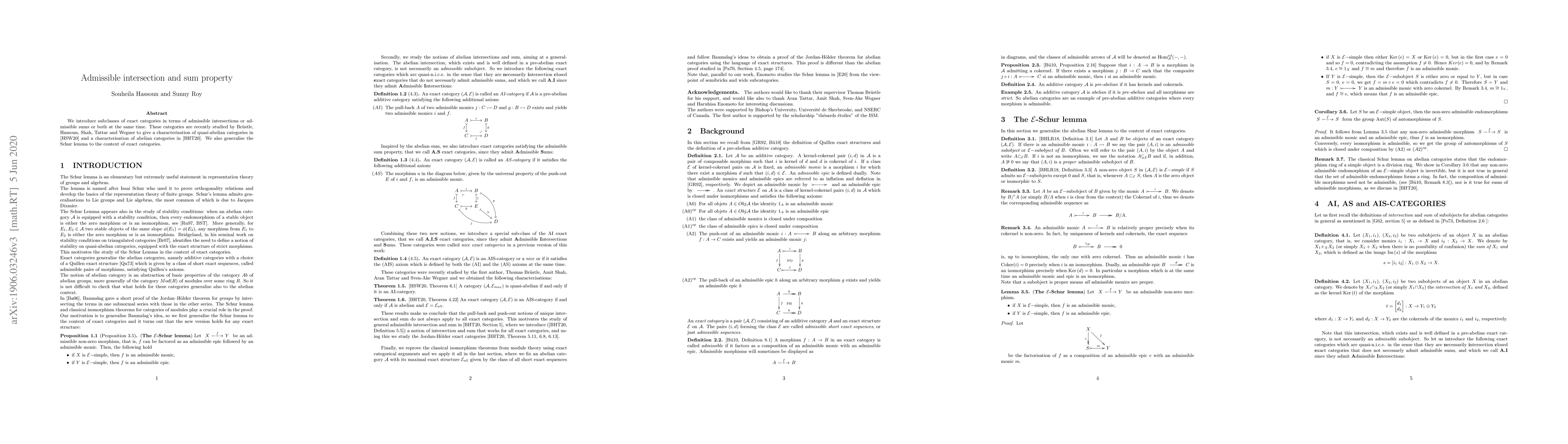 We introduce subclasses of exact categories in terms of admissible intersections or admissible sums or both at the same time. These categories are recently studied by Br\"ustle, Hassoun, Shah, Tattar and Wegner to give characterisations of quasi-abelian and abelian categories. We also generalise the Schur lemma to the context of exact categories.