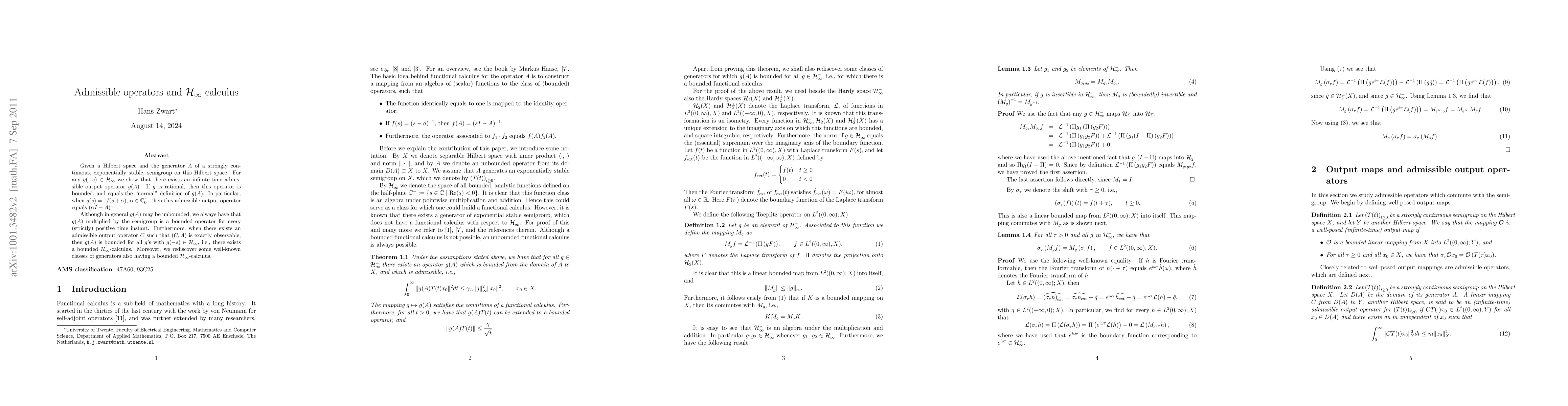 Given a Hilbert space and the generator $A$ of a strongly continuous, exponentially stable, semigroup on this Hilbert space. For any $g(-s) \in {\mathcal H}_{\infty}$ we show that there exists an infinite-time admissible output operator $g(A)$. If $g$ is rational, then this operator is bounded, and equals the "normal" definition of $g(A)$. In particular, when $g(s)=1/(s + \alpha)$, $ \alpha \in {\mathbb C}_0^+$, then this admissible output operator equals $(\alpha I - A)^{-1}$. Although in general $g(A)$ may be unbounded, we always have that $g(A)$ multiplied by the semigroup is a bounded operator for every (strictly) positive time instant. Furthermore, when there exists an admissible output operator $C$ such that $(C,A)$ is exactly observable, then $g(A)$ is bounded for all $g$'s with $g(-s) \in {\mathcal H}_{\infty}$, i.e., there exists a bounded ${\mathcal H}_{\infty}$-calculus. Moreover, we rediscover some well-known classes of generators also having a bounded ${\mathcal H}_{\infty}$-calculus.