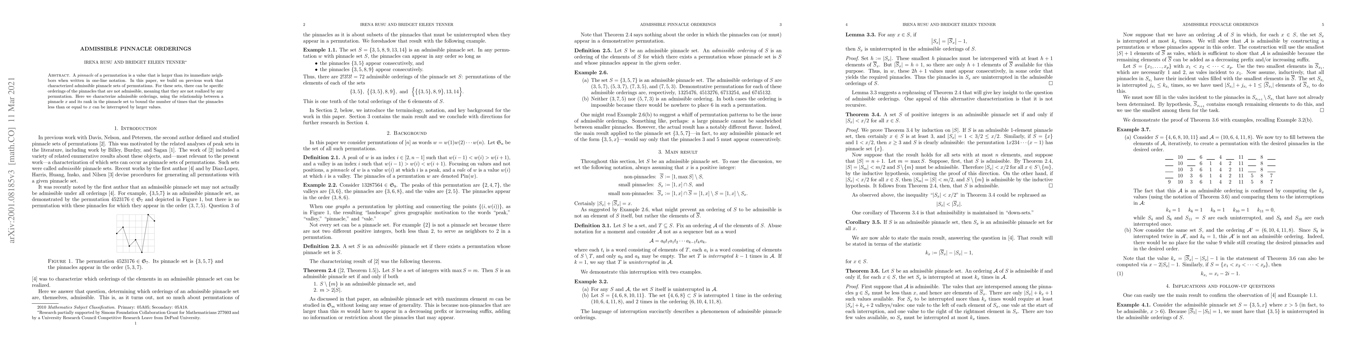 A pinnacle of a permutation is a value that is larger than its immediate neighbors when written in one-line notation. In this paper, we build on previous work that characterized admissible pinnacle sets of permutations. For these sets, there can be specific orderings of the pinnacles that are not admissible, meaning that they are not realized by any permutation. Here we characterize admissible orderings, using the relationship between a pinnacle x and its rank in the pinnacle set to bound the number of times that the pinnacles less than or equal to x can be interrupted by larger values.