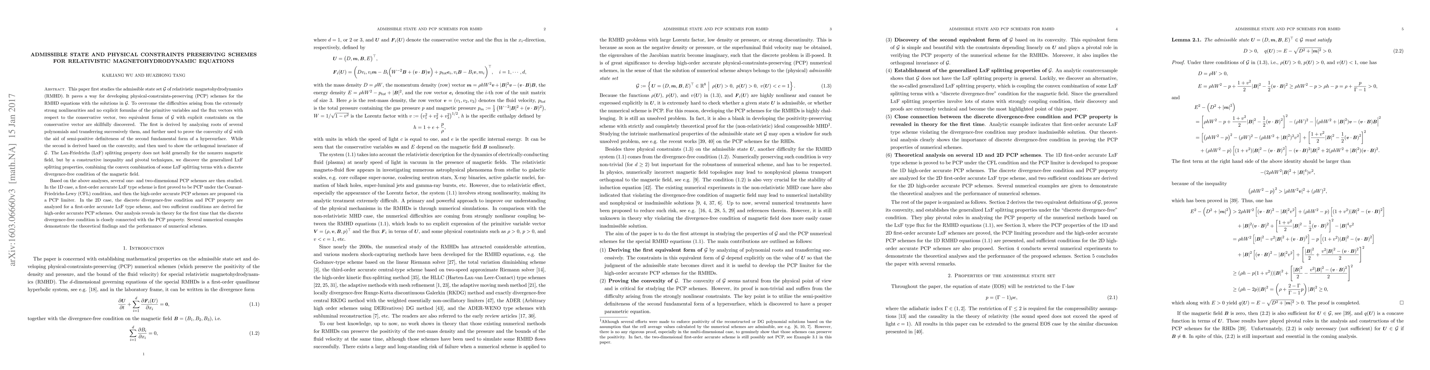This paper explores the admissible state set $\mathcal G$ for relativistic magnetohydrodynamics (RMHD) and develops physical-constraints-preserving (PCP) schemes for RMHD equations. It introduces two equivalent forms of $\mathcal G$ and proves their properties, leading to the discovery of generalized Lax-Friedrichs splitting properties and the development of PCP schemes in both 1D and 2D cases.