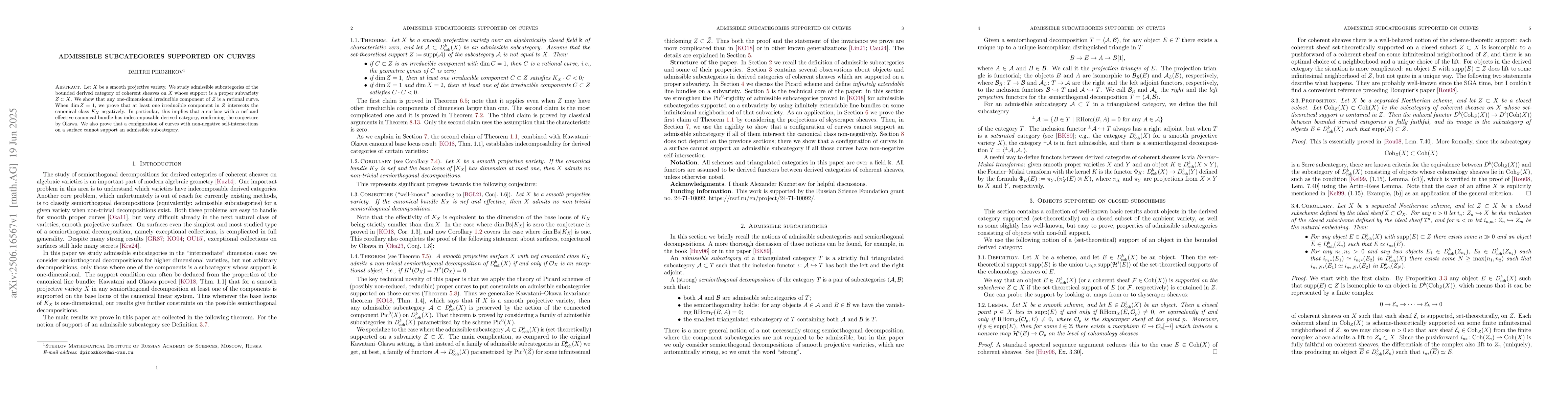 This research investigates admissible subcategories in derived categories of coherent sheaves on smooth projective varieties, focusing on those supported on proper subvarieties. It proves that one-dimensional irreducible components of such subvarieties are rational curves, and at least one intersects the canonical class negatively when the subvariety's dimension is one. This confirms Okawa's conjecture about surfaces with nef and effective canonical bundles having indecomposable derived categories. The study also shows configurations of curves with non-negative self-intersections on a surface cannot support admissible subcategories.