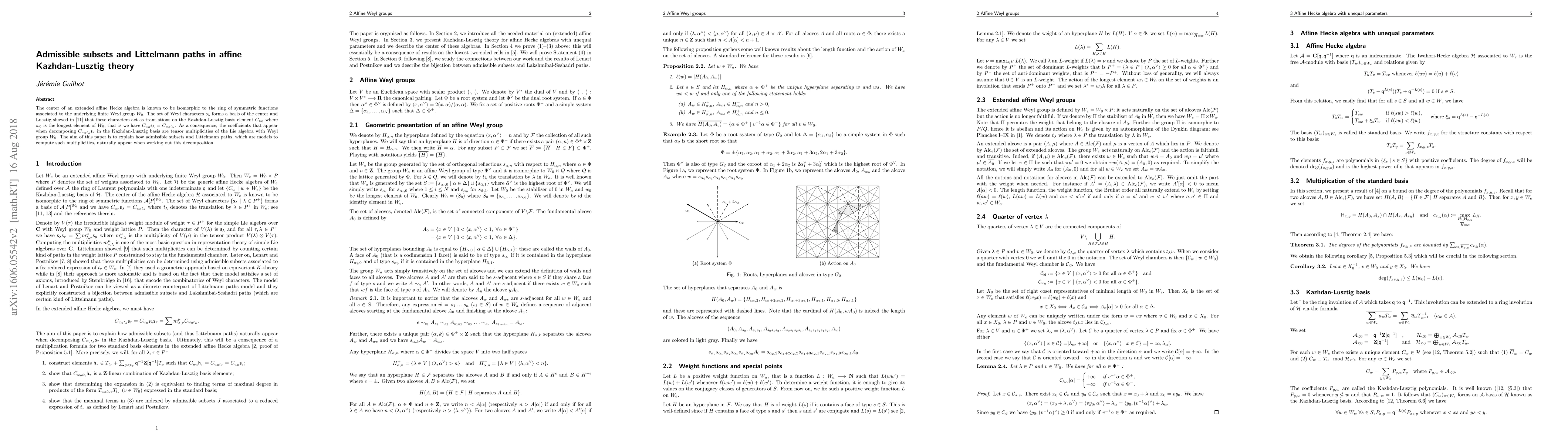 This paper explores how admissible subsets and Littelmann paths emerge in the decomposition of the longest element in the affine Hecke algebra's center acting on the Kazhdan-Lusztig basis, revealing connections to tensor multiplicities in the associated Lie algebra.