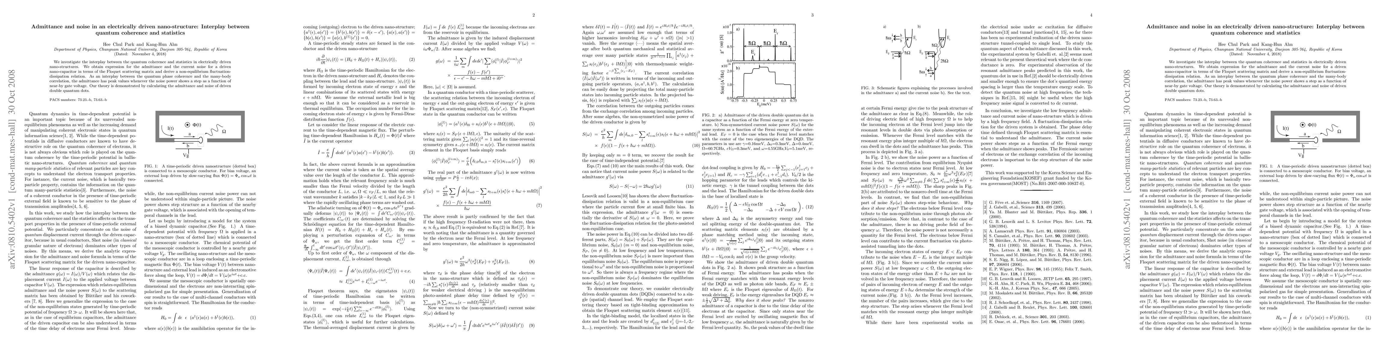 This paper explores the relationship between quantum coherence and statistics in electrically driven nano-structures, deriving expressions for admittance and current noise using the Floquet scattering matrix. It reveals a non-equilibrium fluctuation-dissipation relation and demonstrates that admittance peaks correlate with noise power steps near gate voltage.