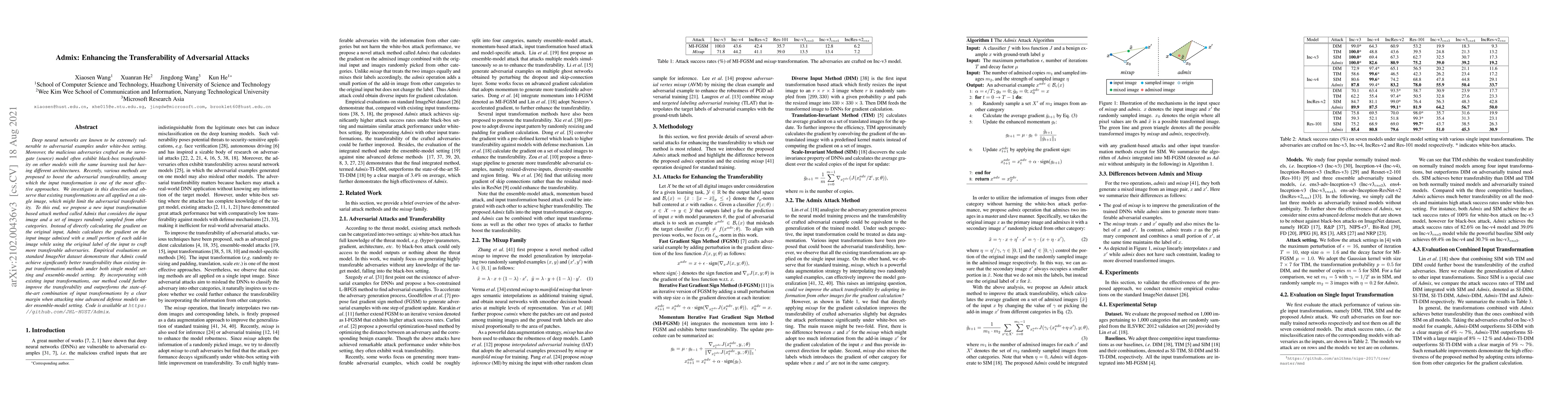 The Admix method enhances the transferability of adversarial attacks by transforming input images using a mix of the target image and randomly sampled images from other categories, achieving superior transferability compared to existing methods. Combined with other input transformations, Admix outperforms state-of-the-art techniques in attacking advanced defense models in ensemble settings.