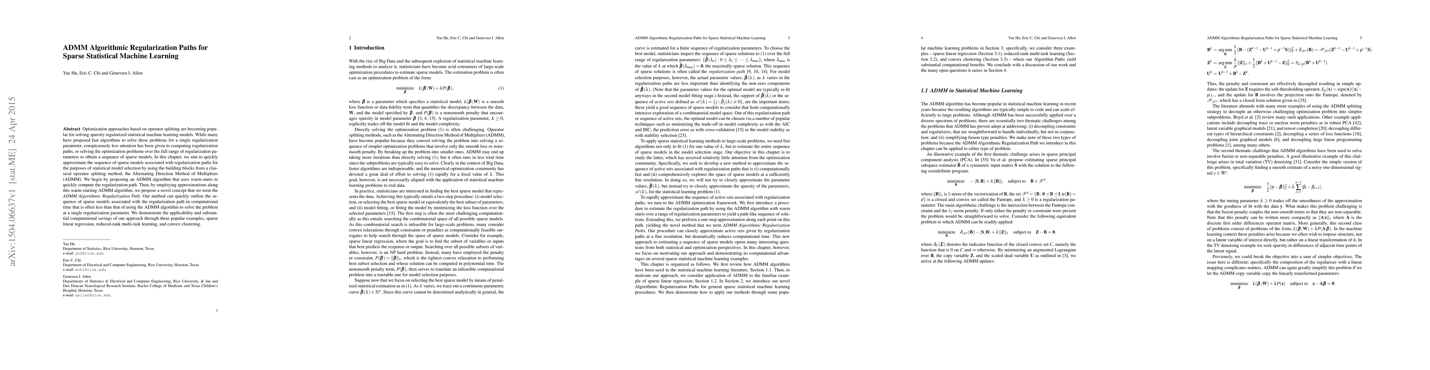Optimization approaches based on operator splitting are becoming popular for solving sparsity regularized statistical machine learning models. While many have proposed fast algorithms to solve these problems for a single regularization parameter, conspicuously less attention has been given to computing regularization paths, or solving the optimization problems over the full range of regularization parameters to obtain a sequence of sparse models. In this chapter, we aim to quickly approximate the sequence of sparse models associated with regularization paths for the purposes of statistical model selection by using the building blocks from a classical operator splitting method, the Alternating Direction Method of Multipliers (ADMM). We begin by proposing an ADMM algorithm that uses warm-starts to quickly compute the regularization path. Then, by employing approximations along this warm-starting ADMM algorithm, we propose a novel concept that we term the ADMM Algorithmic Regularization Path. Our method can quickly outline the sequence of sparse models associated with the regularization path in computational time that is often less than that of using the ADMM algorithm to solve the problem at a single regularization parameter. We demonstrate the applicability and substantial computational savings of our approach through three popular examples, sparse linear regression, reduced-rank multi-task learning, and convex clustering.