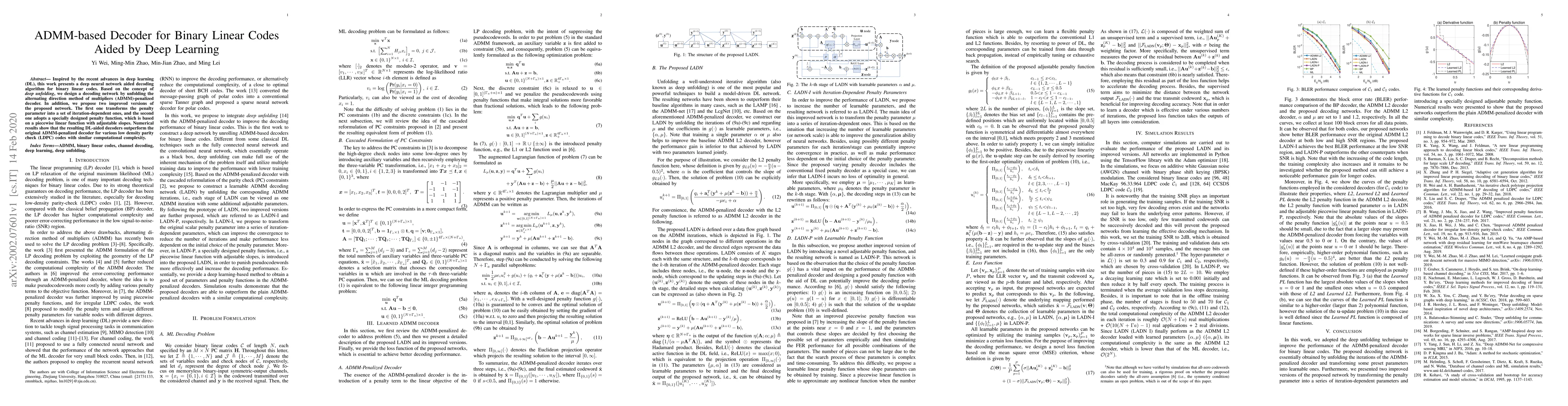 This paper proposes a deep learning-based decoder for binary linear codes by unfolding the ADMM-penalized decoder. It introduces two enhancements: iteration-dependent penalty parameters and a piecewise linear penalty function. The results indicate that the proposed deep learning decoders outperform the original ADMM decoder for various LDPC codes with comparable computational complexity.