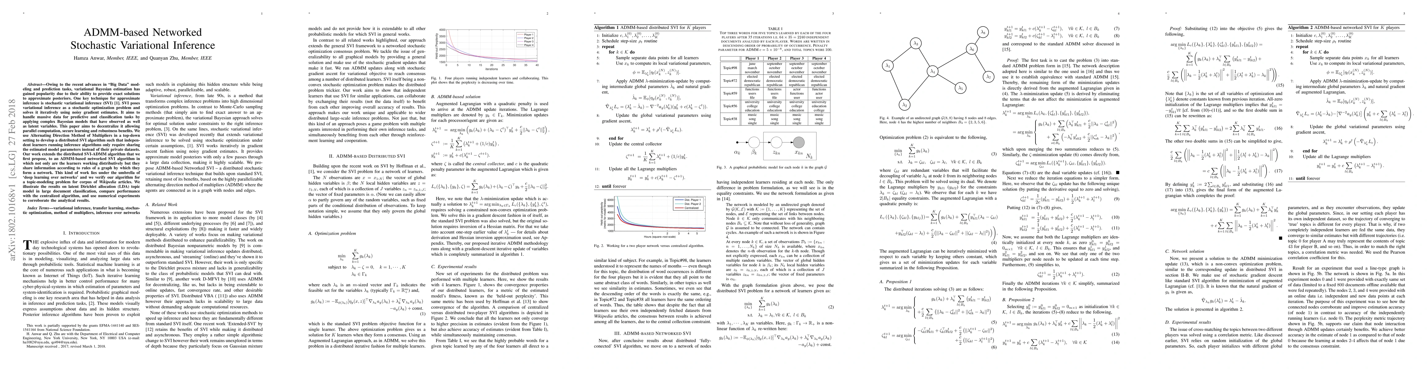This paper proposes an ADMM-based networked stochastic variational inference algorithm to decentralize and parallelize SVI, enabling secure and robust distributed learning. The method allows independent learners to share only model parameters rather than private data, and is validated through a topic-modeling application on Wikipedia articles, demonstrating performance comparable to centralized algorithms.