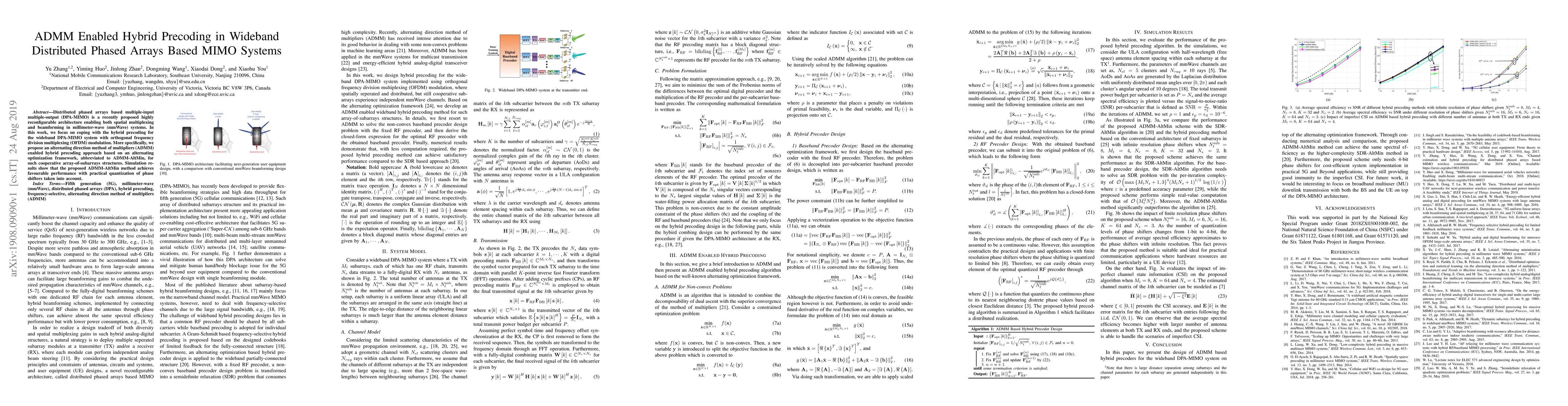 This paper proposes an ADMM-enabled hybrid precoding method, called ADMM-AltMin, for wideband distributed phased arrays in MIMO systems using OFDM. The approach optimizes precoding in cooperative array-of-subarrays structures, achieving favorable performance even with practical phase shifter quantization.