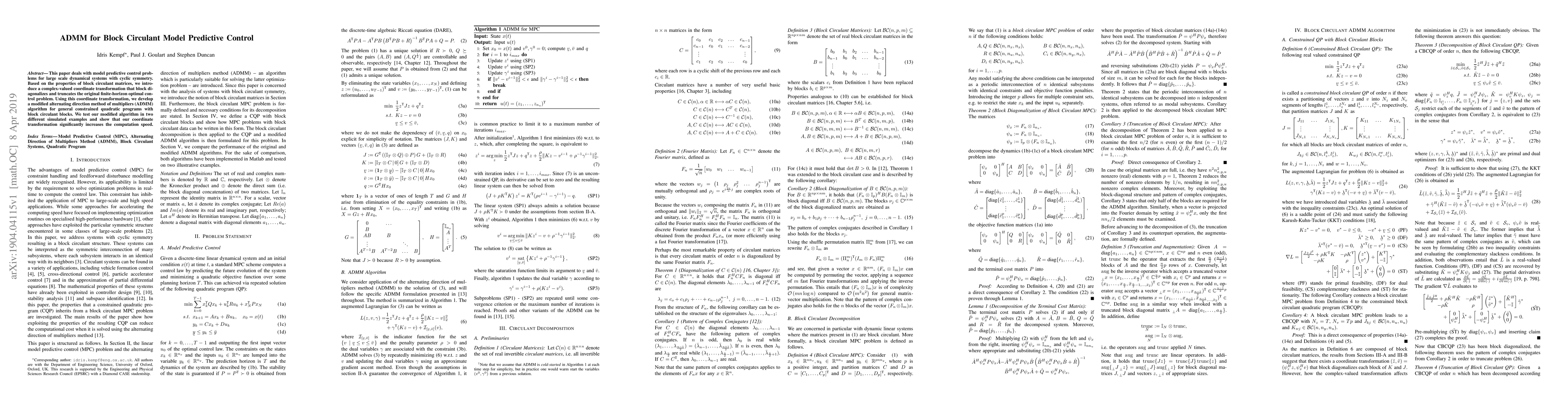 This paper deals with model predictive control problems for large scale dynamical systems with cyclic symmetry. Based on the properties of block circulant matrices, we introduce a complex-valued coordinate transformation that block diagonalizes and truncates the original finite-horizon optimal control problem. Using this coordinate transformation, we develop a modified alternating direction method of multipliers (ADMM) algorithm for general constrained quadratic programs with block circulant blocks. We test our modified algorithm in two different simulated examples and show that our coordinate transformation significantly increases the computation speed.