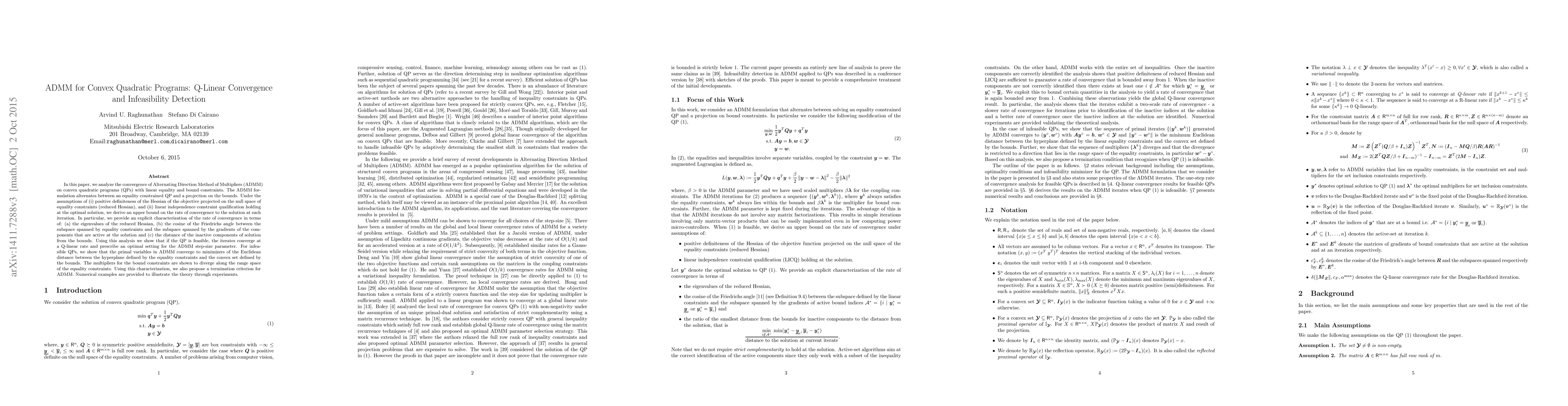 This paper analyzes the convergence of ADMM for convex quadratic programs, proving Q-linear convergence under feasibility and infeasibility detection. It provides an explicit convergence rate based on the reduced Hessian's eigenvalues and the Friedrichs angle, and proposes a termination criterion for detecting infeasibility.