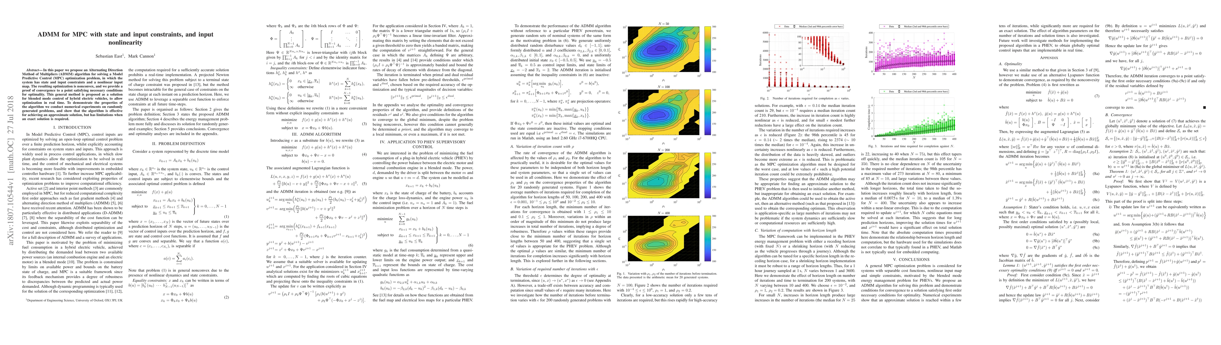 This paper proposes an ADMM algorithm for solving MPC optimization problems with state and input constraints, and nonlinear input maps, demonstrating convergence to necessary optimality conditions. Numerical experiments show the method's effectiveness in real-time optimization for hybrid electric vehicles, though it struggles with exact solutions.