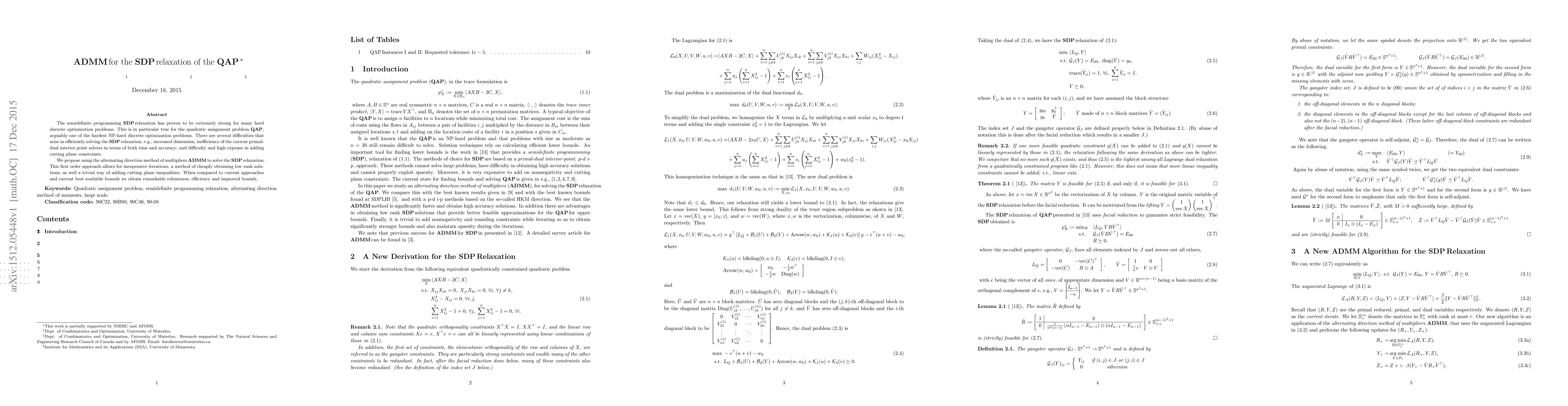 The ADMM method is proposed to solve the SDP relaxation of the QAP, offering improved robustness, efficiency, and bounds compared to existing approaches.
