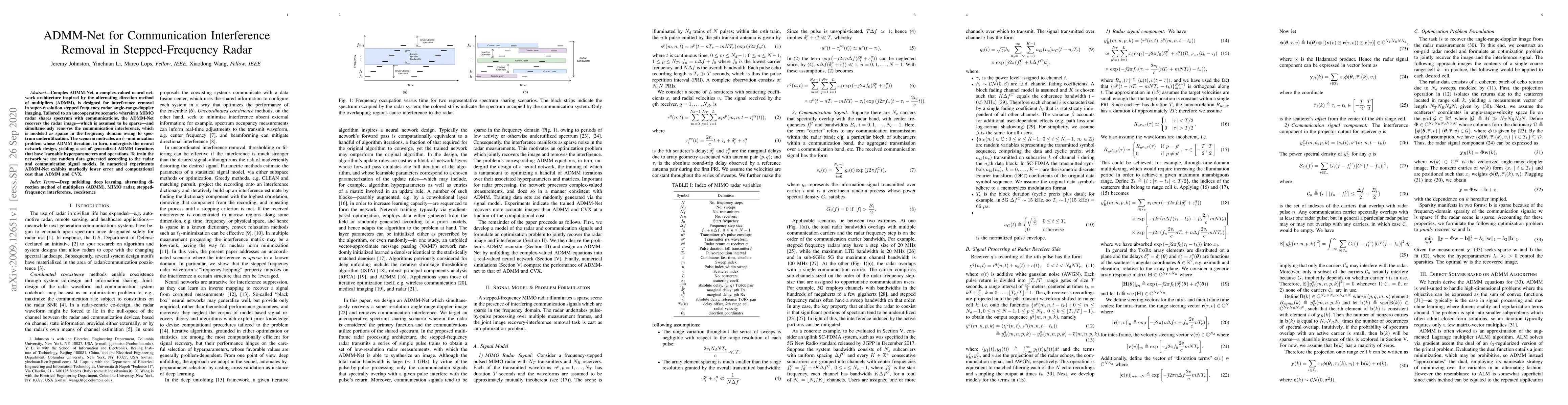 The ADMM-Net neural network, inspired by the alternating direction method of multipliers, is designed to remove communication interference in super-resolution stepped-frequency radar imaging. It effectively recovers sparse radar images while simultaneously addressing sparse frequency domain interference, demonstrating lower error and computational cost compared to traditional methods.
