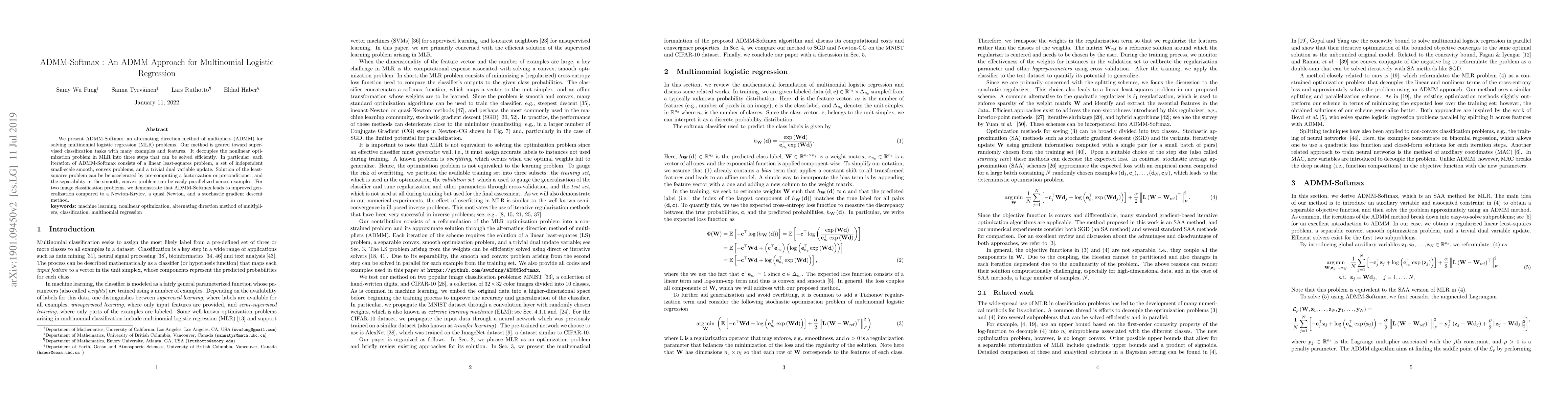 The paper presents ADMM-Softmax, an ADMM approach for multinomial logistic regression (MLR) problems, designed for supervised classification tasks with many examples and features. It decouples the nonlinear optimization problem in MLR into three steps: a linear least-squares problem, a set of independent small-scale smooth, convex problems, and a trivial dual variable update.