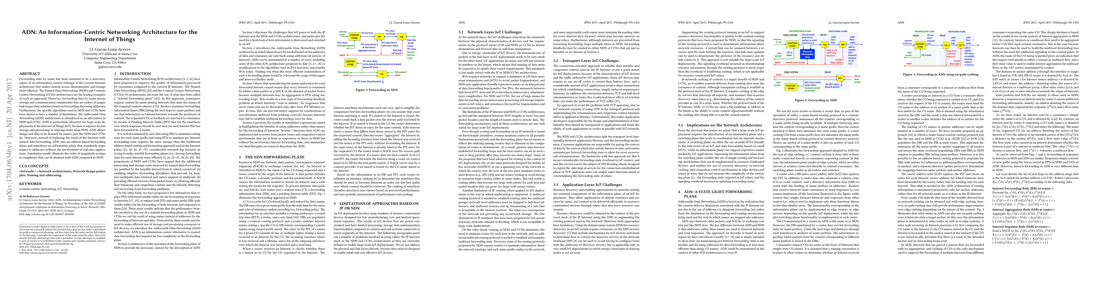 The ADN architecture presents an alternative to named-data forwarding in information-centric networking, offering significant reductions in storage and processing complexity for Internet of Things deployments. Unlike NDN and CCNx, ADN employs an address-based forwarding plane with an information plane that maps names to addresses, achieving substantial efficiency gains.