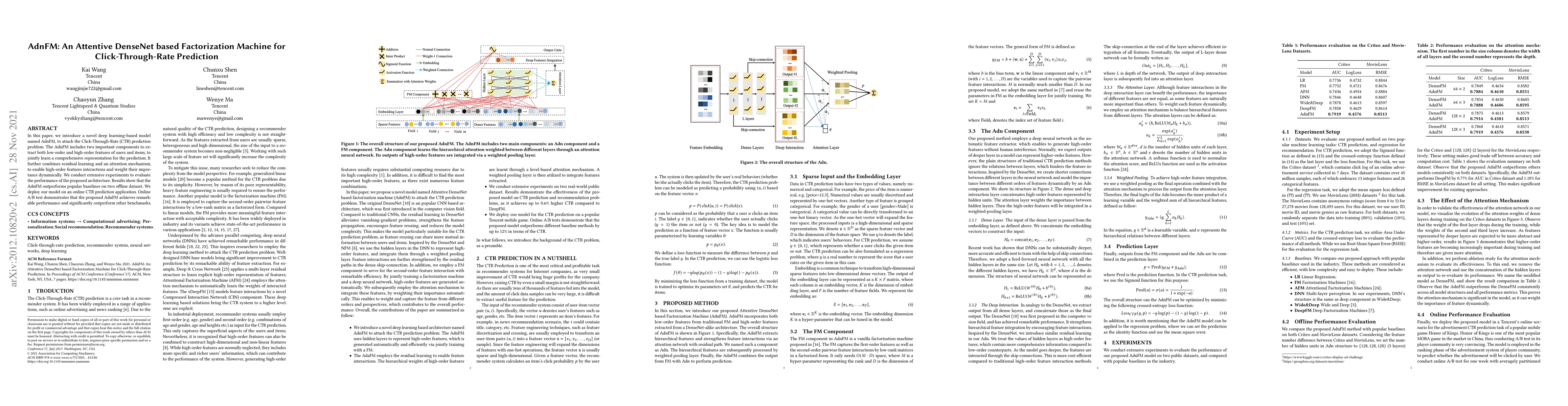 The paper proposes AdnFM, an Attentive DenseNet based Factorization Machine for CTR prediction, which leverages DenseNet to extract high-order feature interactions implicitly and efficiently through an attention mechanism. Experiments demonstrate AdnFM's superior performance in CTR prediction compared to traditional methods.