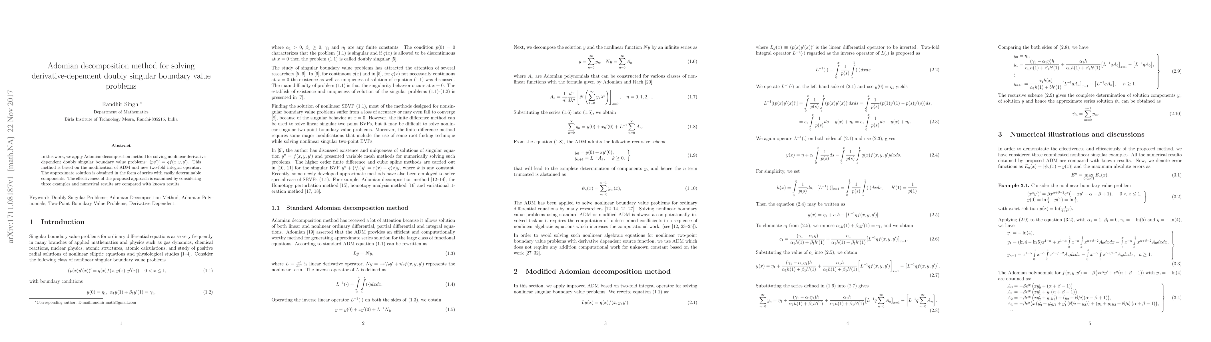 This paper applies the modified Adomian decomposition method (ADM) to solve nonlinear derivative-dependent doubly singular boundary value problems. The method yields an approximate series solution, and its effectiveness is demonstrated through three examples with numerical results compared to known solutions.