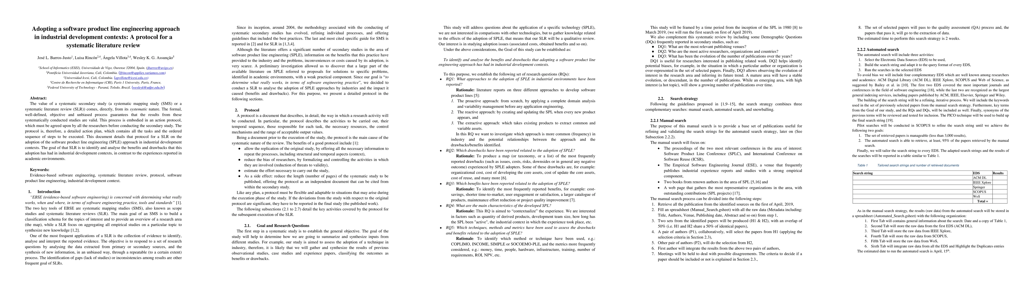 This paper outlines a protocol for a systematic literature review to assess the adoption of software product line engineering (SPLE) in industrial contexts, comparing its benefits and drawbacks to academic experiences. The protocol ensures a systematic, objective, and unbiased process for conducting the review.