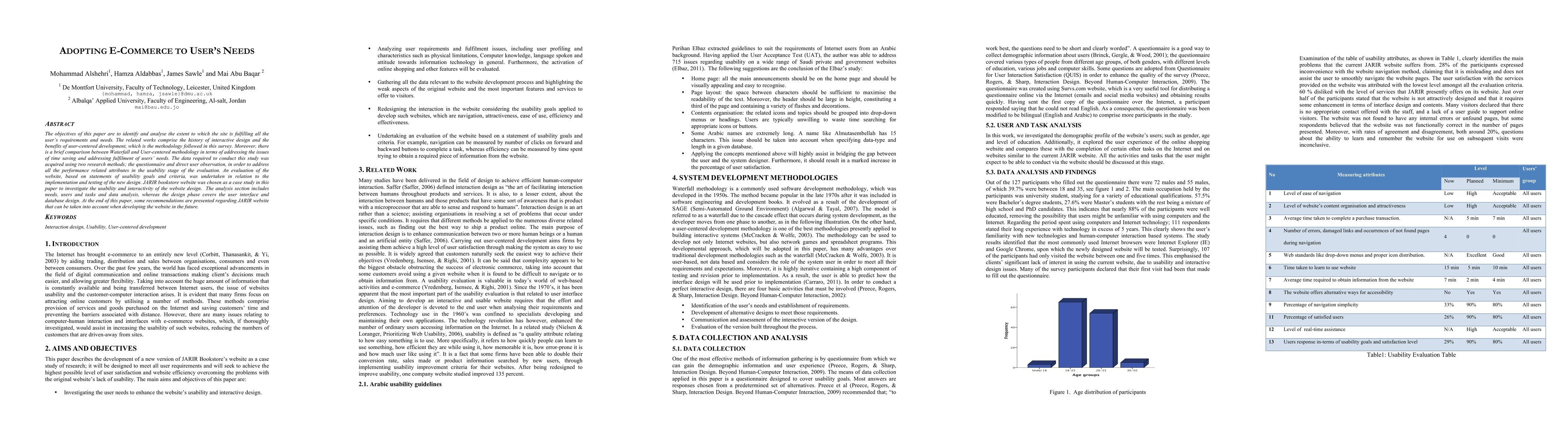 This study investigates the usability of JARIR bookstore website, analyzing its performance against user needs and recommending improvements for future development. It compares two design methodologies (Waterfall and User-centered) to address user requirements and time-saving issues.