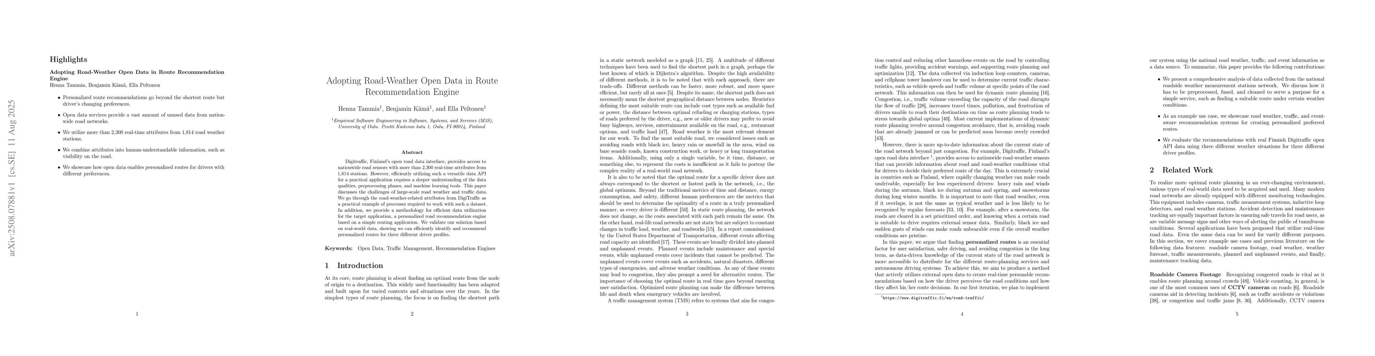 The paper presents a methodology for efficiently utilizing large-scale road weather and traffic data, specifically focusing on DigiTraffic's open road data interface, to create a personalized route recommendation engine.