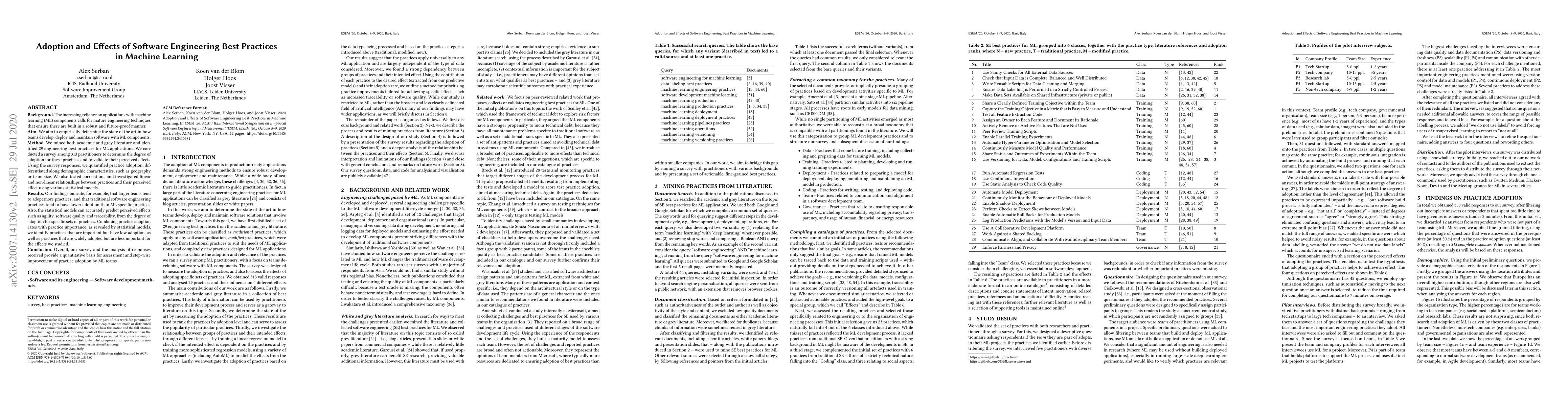 This study surveys 313 practitioners to empirically determine the adoption and effects of 29 software engineering best practices in machine learning (ML). Findings reveal that larger teams adopt more practices, with traditional software engineering practices having lower adoption than ML-specific ones. Statistical models show accurate predictions of perceived effects like agility and software quality based on practice adoption, highlighting important yet under-adopted practices.