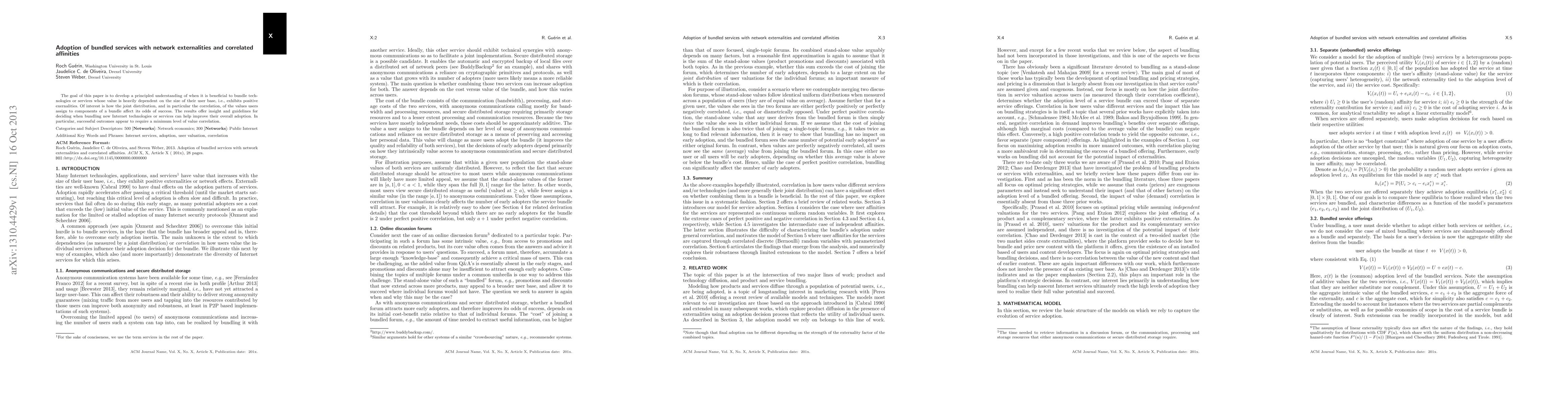 The goal of this paper is to develop a principled understanding of when it is beneficial to bundle technologies or services whose value is heavily dependent on the size of their user base, i.e., exhibits positive exernalities. Of interest is how the joint distribution, and in particular the correlation, of the values users assign to components of a bundle affect its odds of success. The results offer insight and guidelines for deciding when bundling new Internet technologies or services can help improve their overall adoption. In particular, successful outcomes appear to require a minimum level of value correlation.