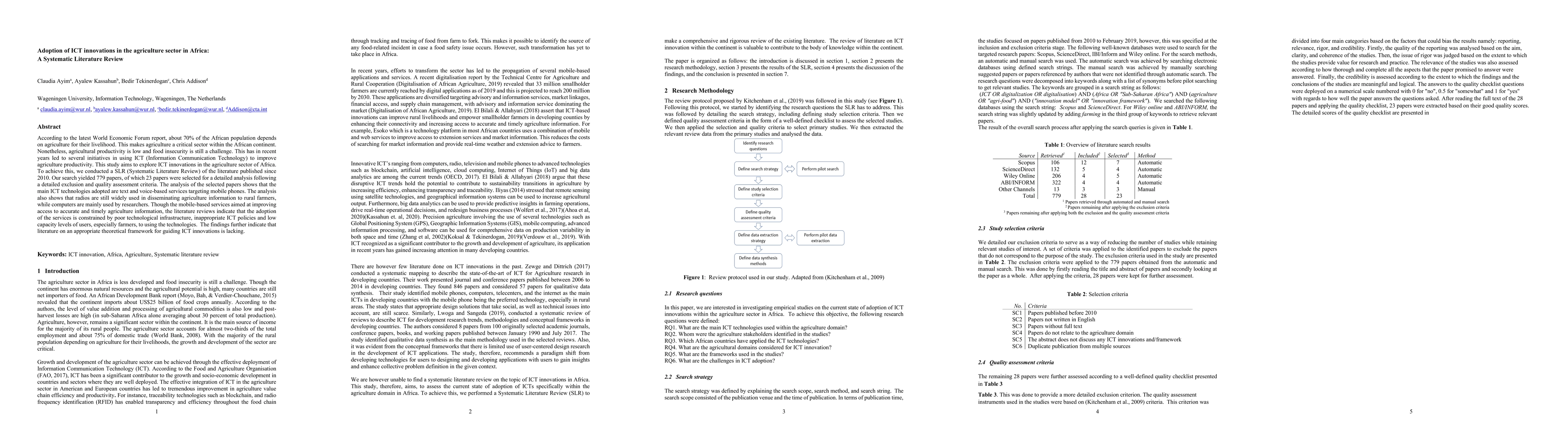 This systematic literature review examines ICT innovations in Africa's agriculture sector, finding that mobile-based text and voice services are prevalent but adoption is hindered by poor infrastructure, inadequate policies, and low user capacity. The study highlights a lack of theoretical frameworks to guide ICT innovations.