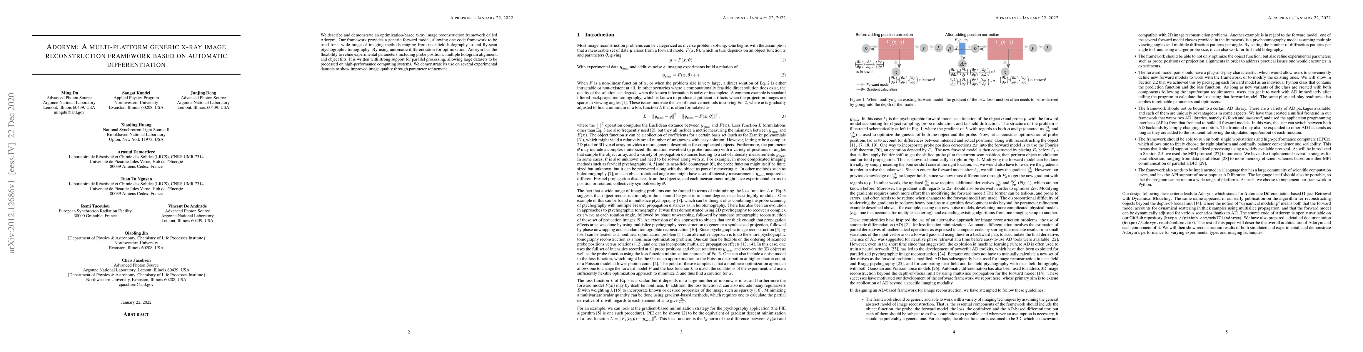Adorym is a versatile x-ray image reconstruction framework utilizing automatic differentiation for optimization, supporting various imaging methods and parallel processing. It refines experimental parameters and demonstrates improved image quality across multiple datasets.
