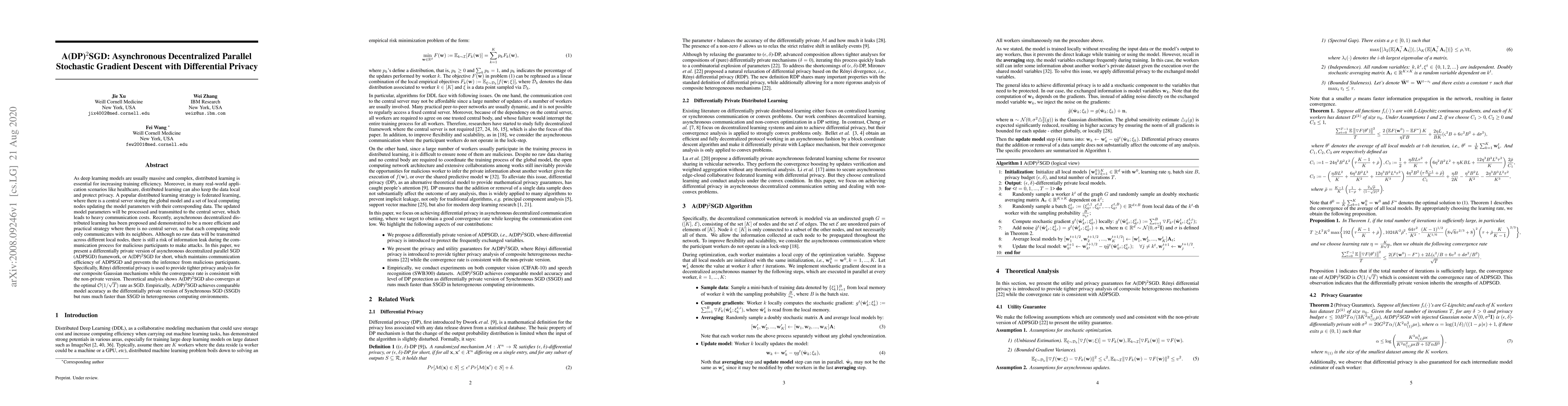 As deep learning models are usually massive and complex, distributed learning is essential for increasing training efficiency. Moreover, in many real-world application scenarios like healthcare, distributed learning can also keep the data local and protect privacy. A popular distributed learning strategy is federated learning, where there is a central server storing the global model and a set of local computing nodes updating the model parameters with their corresponding data. The updated model parameters will be processed and transmitted to the central server, which leads to heavy communication costs. Recently, asynchronous decentralized distributed learning has been proposed and demonstrated to be a more efficient and practical strategy where there is no central server, so that each computing node only communicates with its neighbors. Although no raw data will be transmitted across different local nodes, there is still a risk of information leak during the communication process for malicious participants to make attacks. In this paper, we present a differentially private version of asynchronous decentralized parallel SGD (ADPSGD) framework, or A(DP)$^2$SGD for short, which maintains communication efficiency of ADPSGD and prevents the inference from malicious participants. Specifically, R{\'e}nyi differential privacy is used to provide tighter privacy analysis for our composite Gaussian mechanisms while the convergence rate is consistent with the non-private version. Theoretical analysis shows A(DP)$^2$SGD also converges at the optimal $\mathcal{O}(1/\sqrt{T})$ rate as SGD. Empirically, A(DP)$^2$SGD achieves comparable model accuracy as the differentially private version of Synchronous SGD (SSGD) but runs much faster than SSGD in heterogeneous computing environments.