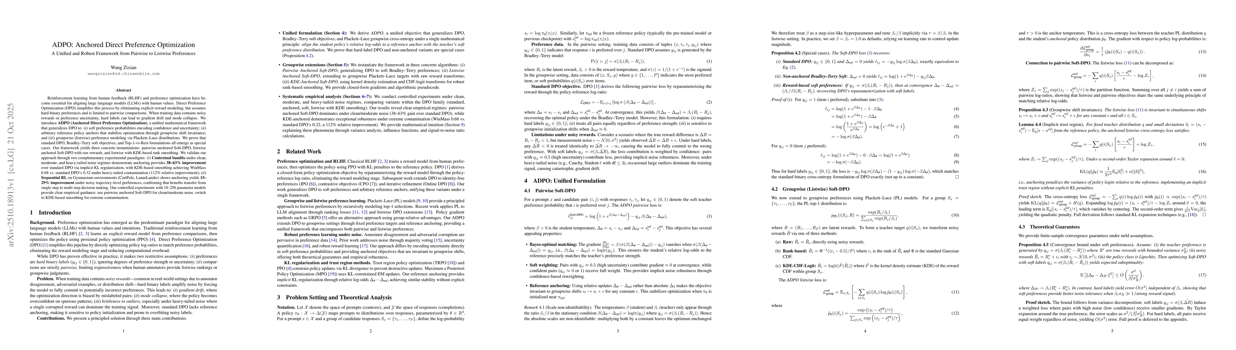 Anchored Direct Preference Optimization (ADPO) is a unified framework that generalizes Direct Preference Optimization (DPO) with soft preferences, reference-policy anchoring, and groupwise extensions. While standard DPO assumes hard binary labels and pairwise comparisons, ADPO introduces: (i) soft preference probabilities that encode uncertainty and mitigate gradient drift; (ii) arbitrary reference-policy anchors that stabilize training via groupwise shift invariance and implicit KL regularization; and (iii) listwise preference modeling through Plackett-Luce distributions. We prove that DPO, Bradley-Terry objectives, and Top-1-vs-Rest formulations emerge as special cases. ADPO yields three practical variants: pairwise anchored Soft-DPO, listwise anchored Soft-DPO with raw rewards, and KDE-based listwise smoothing for heavy-tailed noise. In contextual bandits, anchoring improves WinMass by 38-63% over standard DPO, while KDE smoothing achieves 0.68 vs 0.32 under heavy-tailed contamination (112% relative gain). In sequential reinforcement learning (CartPole, LunarLander), anchoring improves noisy-preference performance by 15-29%, confirming transfer from single-step to multi-step settings. Experiments with 10-256 parameter models provide clear guidance: use pairwise anchored Soft-DPO for clean or moderate noise, and KDE-based listwise ADPO for extreme contamination.