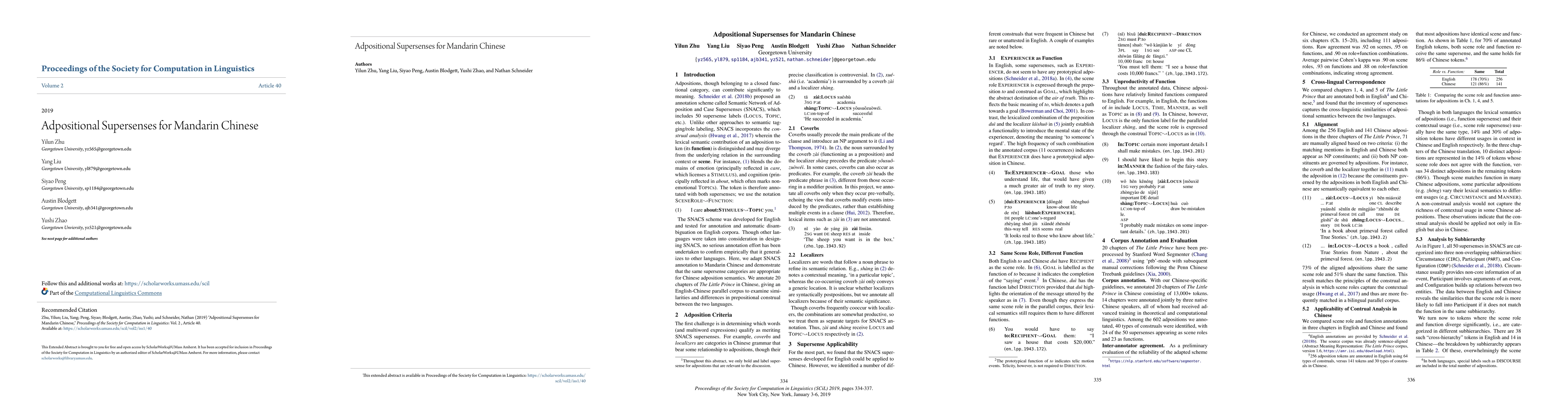 The study adapts the Semantic Network of Adposition and Case Supersenses (SNACS) annotation scheme to Mandarin Chinese, annotating 20 chapters of The Little Prince with high interannotator agreement.
