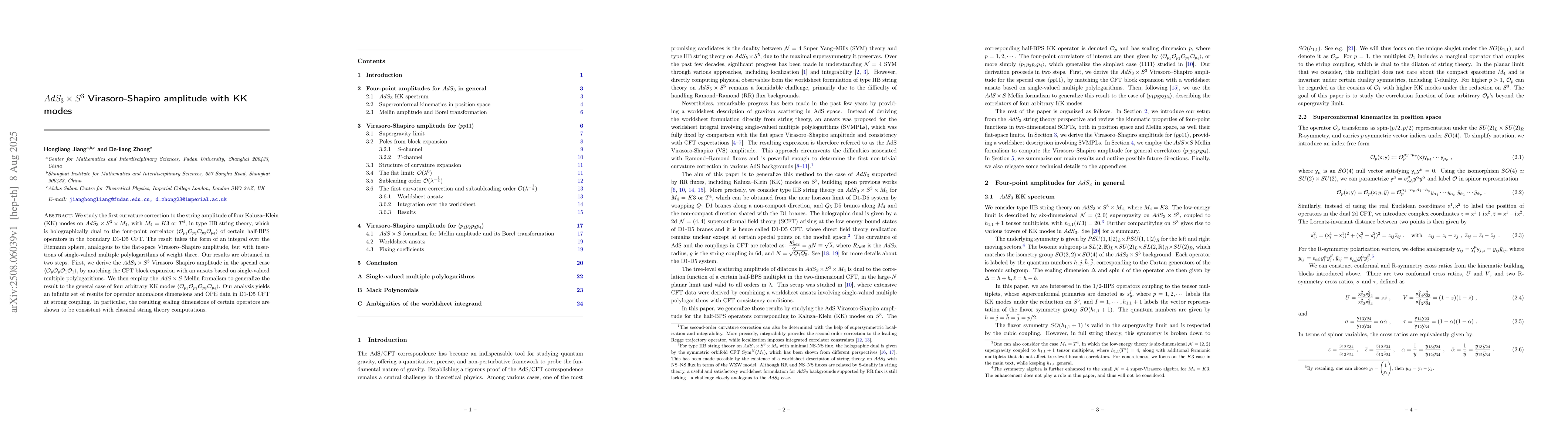 The paper presents a detailed analysis of the AdS$_3$ Virasoro-Shapiro amplitude with KK modes, deriving its form as an integral over the Riemann sphere with insertions of single-valued multiple polylogarithms. It introduces a worldsheet representation of this amplitude using the AdS$_3 \times S^3$ Mellin formalism, providing an infinite set of results for operator anomalous dimensions and OPE data in the D1--D5 CFT at strong coupling.