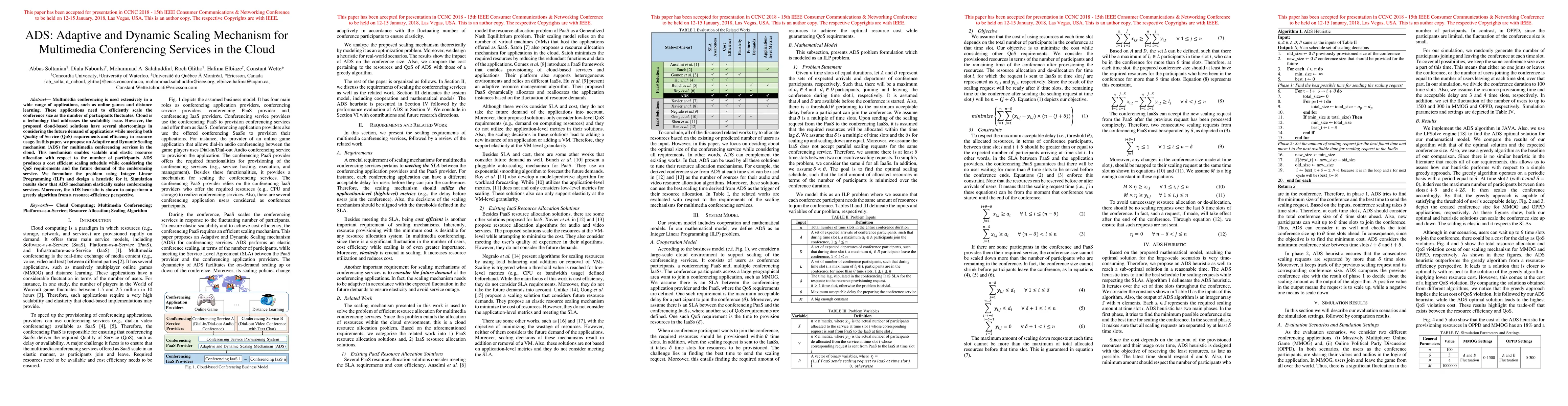 This paper proposes an Adaptive and Dynamic Scaling (ADS) mechanism for cloud-based multimedia conferencing services to efficiently manage fluctuating participant numbers. ADS uses Integer Linear Programming and a heuristic to achieve cost-efficient scaling while ensuring Quality of Service and resource efficiency, outperforming greedy algorithms in simulations.