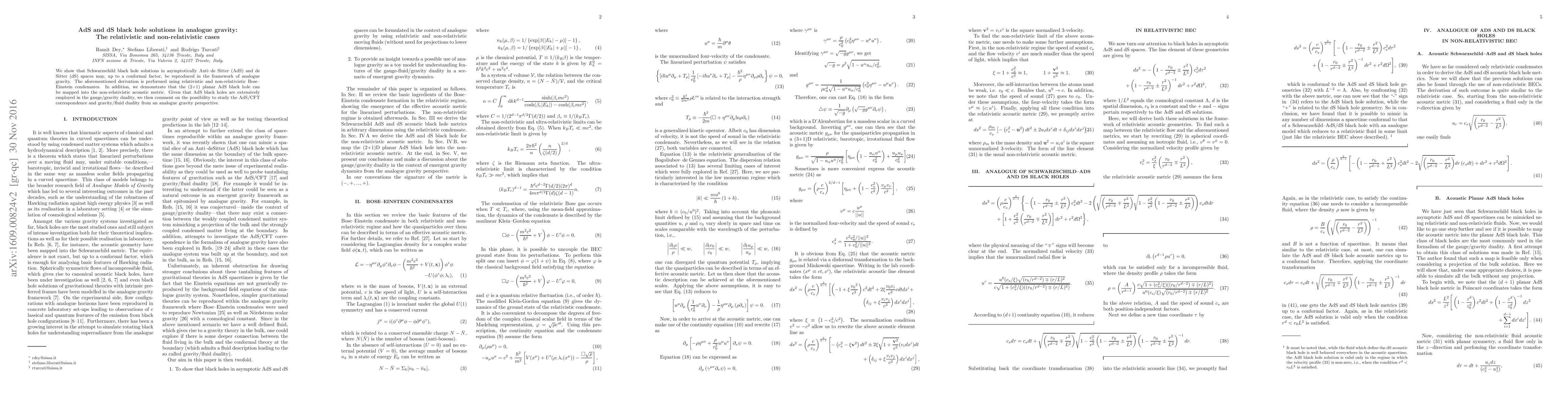 This paper demonstrates that Schwarzschild black holes in AdS and dS spaces can be analogically reproduced using both relativistic and non-relativistic Bose-Einstein condensates within analogue gravity. It also shows the mapping of a (2+1) AdS black hole to a non-relativistic acoustic metric, suggesting potential insights into the AdS/CFT correspondence from an analogue gravity viewpoint.